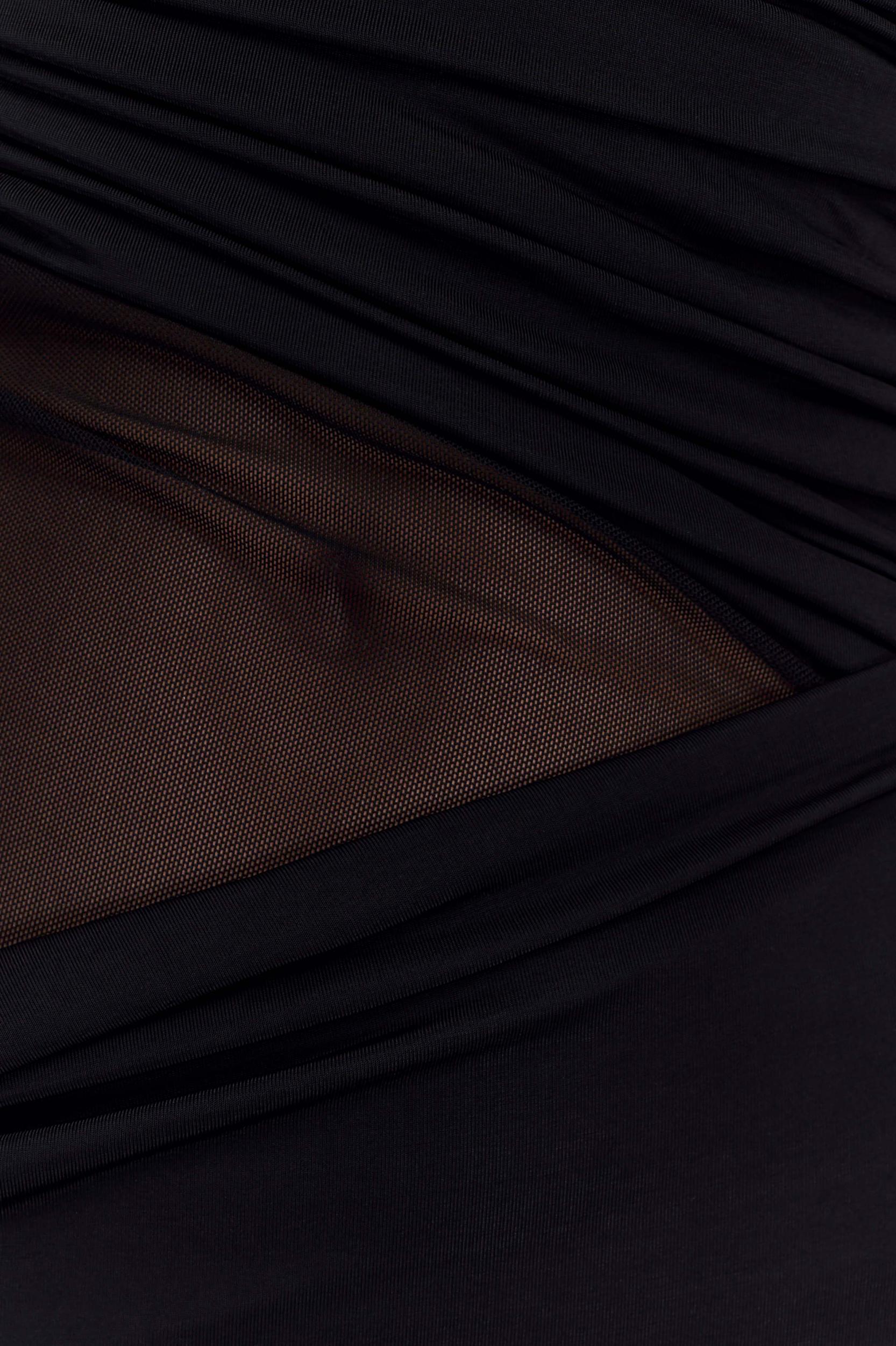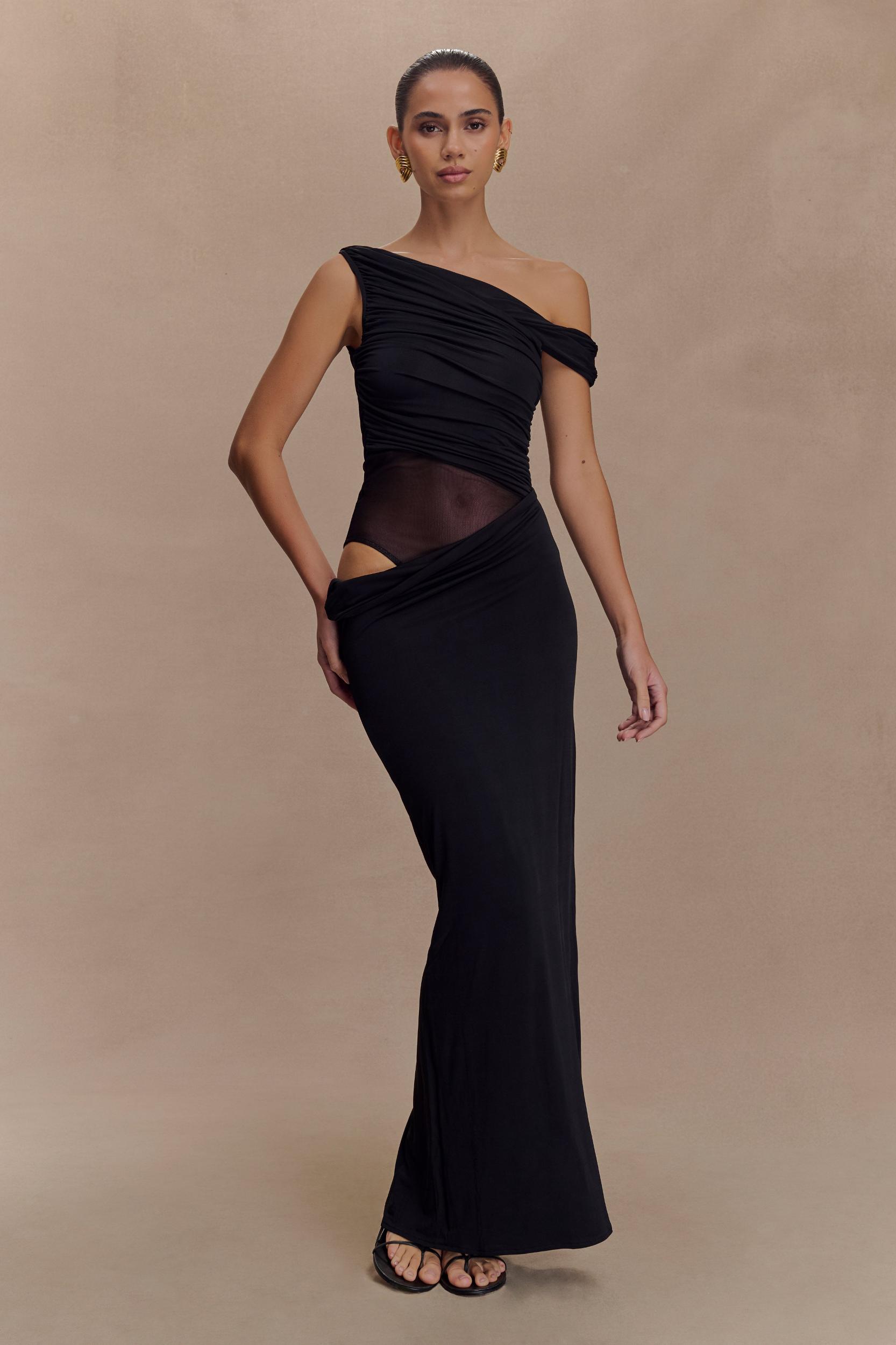 Modern glamour in every drape. The CALLEN One Shoulder Slinky Maxi Dress is designed to make an entrance. Featuring an asymmetrical neckline with a twisted shoulder detail, this statement silhouette is balanced by a gathered bodice and sheer mesh waist panel that subtly reveals while sculpting the figure. A draped skirt overlay flows into a fishtail hem, creating soft movement with every step. Fully lined for a smooth finish, this dress is the perfect blend of modern drama and timeless elegance—made for evenings that call for something unforgettable.