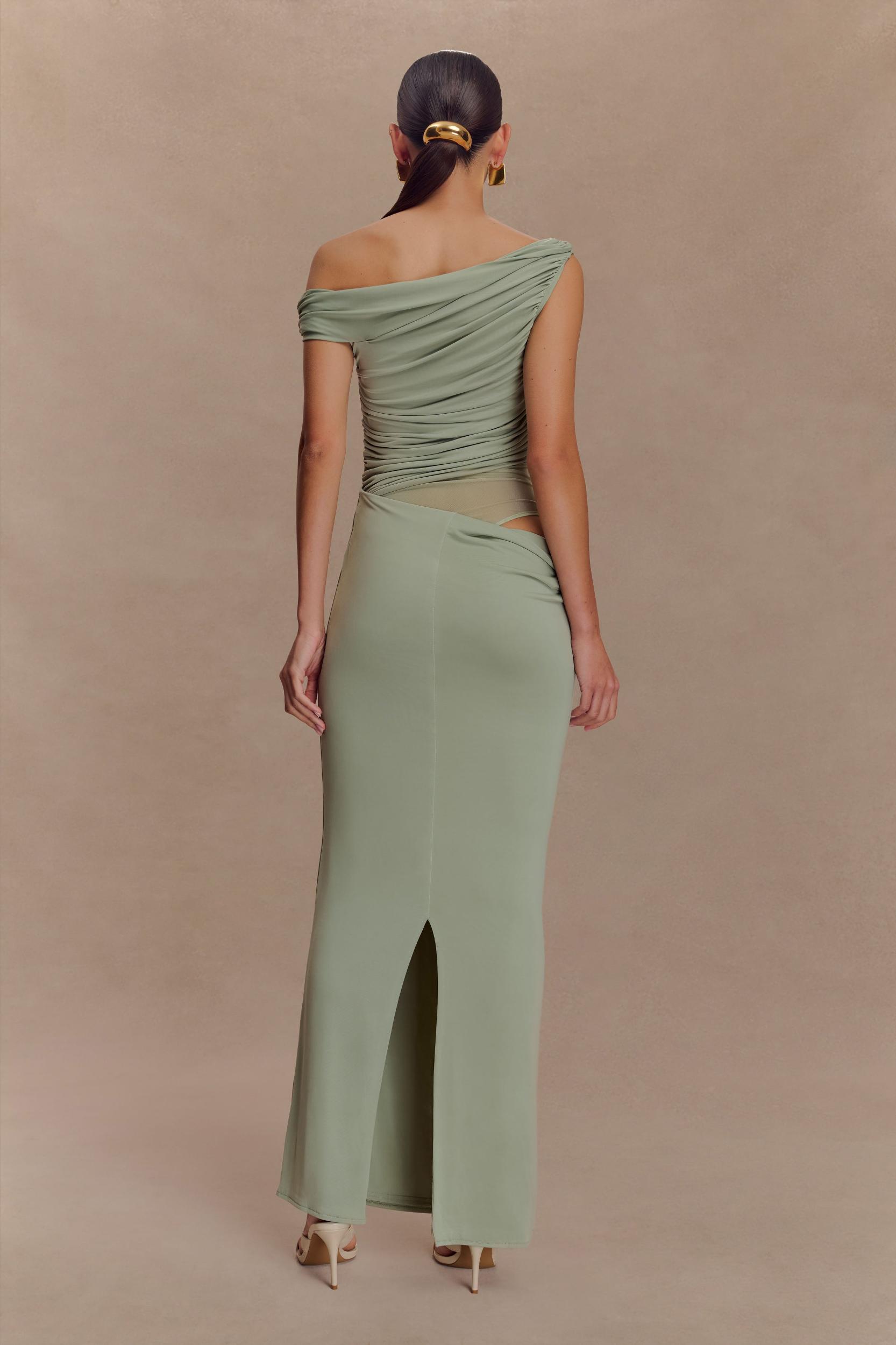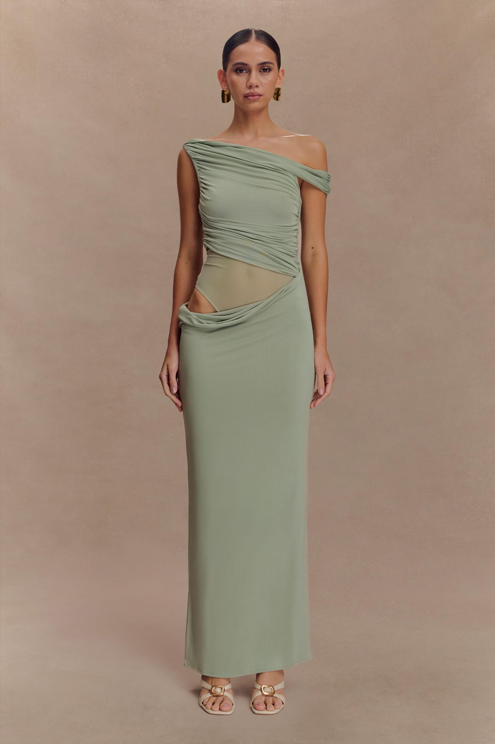 Modern glamour in every drape. The CALLEN One Shoulder Slinky Maxi Dress is designed to make an entrance. Featuring an asymmetrical neckline with a twisted shoulder detail, this statement silhouette is balanced by a gathered bodice and sheer mesh waist panel that subtly reveals while sculpting the figure. A draped skirt overlay flows into a fishtail hem, creating soft movement with every step. Fully lined for a smooth finish, this dress is the perfect blend of modern drama and timeless elegance—made for evenings that call for something unforgettable.