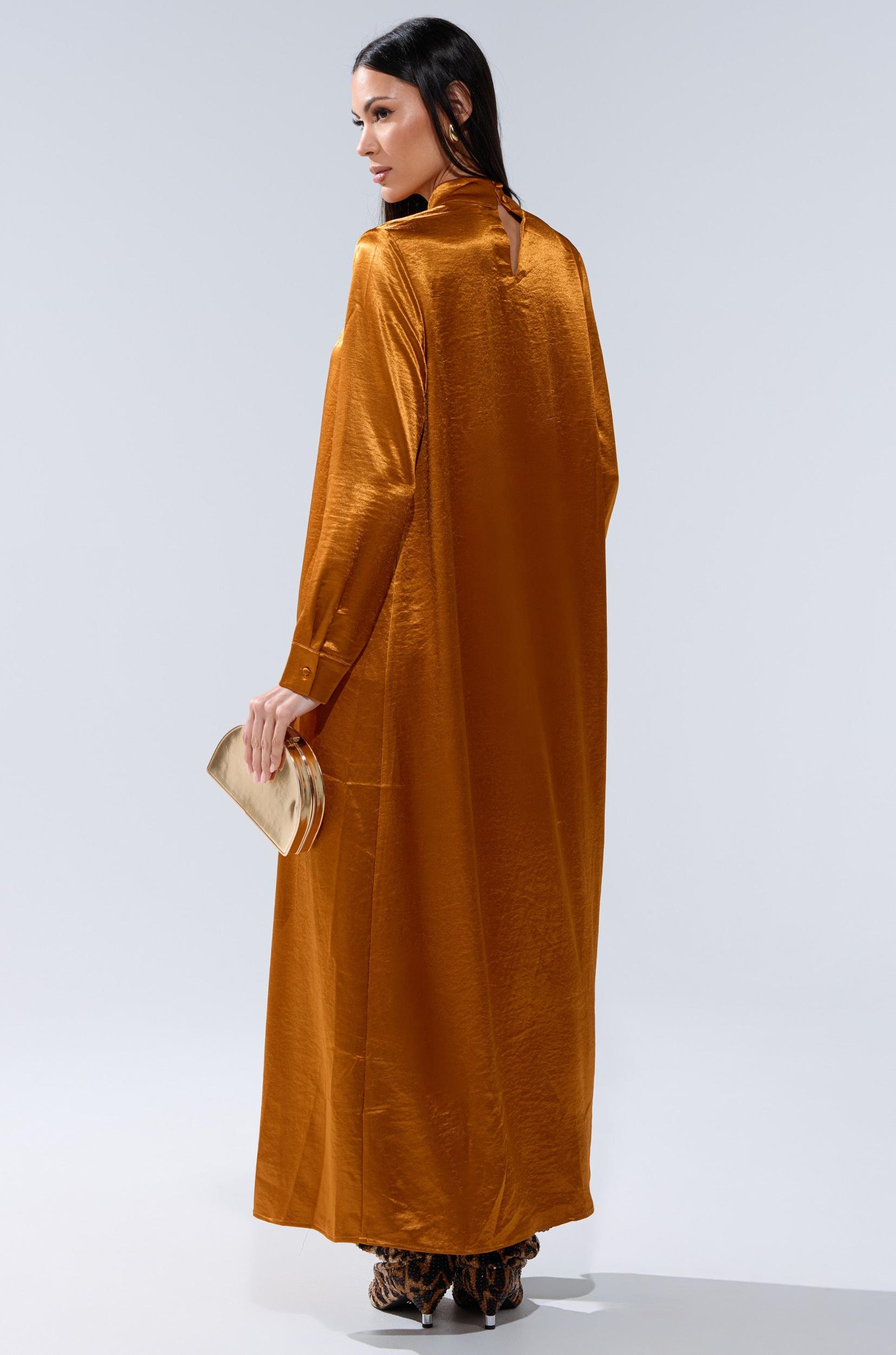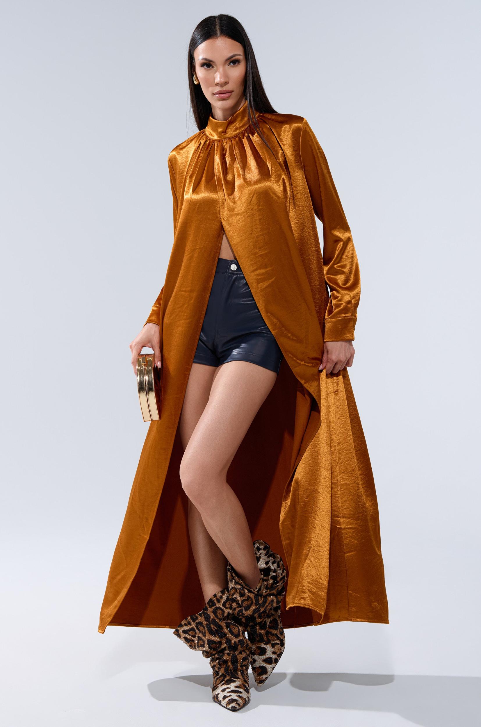 The AKIRA Label Queen Type Blouse is a regal statement piece with timeless sophistication. Crafted from silky-smooth satin, this elegant, floor-grazing top features a high mock neckline with a keyhole opening and tonal button closures at the nape of the neck. Long sleeves with buttoned cuffs add a polished touch, while a dramatic front split seam flows from the midriff to the hem, creating graceful movement. Its versatile design makes it perfect for both refined daywear and elevated evening looks. - 100% Polyester- Hand Wash Cold- No Stretch- Imported (all measurements approximate from size S/M)- 58” Shoulder to Hem- 45” Front Slit- 15” Shoulder to Shoulder- 25” Sleeves- Model is 5’11” and wearing a size S/MProduct ID: 1065828 (all measurements approximate from size 1X/2X)- 60” Shoulder to Hem- 47” Front Slit- 20” Shoulder to Shoulder- 27” SleevesProduct ID: 1065830