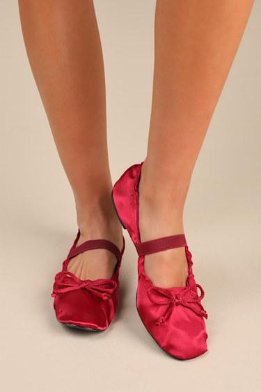 All the coquettish girlies out there are going to adore the Lulus Callinda Red Satin Bow Ballet Flats! Sleek woven satin shapes a classic ballet flat silhouette with a rounded-toe upper and an elasticized scrunched topline. A dainty bow detail accents the low-cut collar, while an elastic vamp strap secures the slip-on design. Available in whole sizes only.