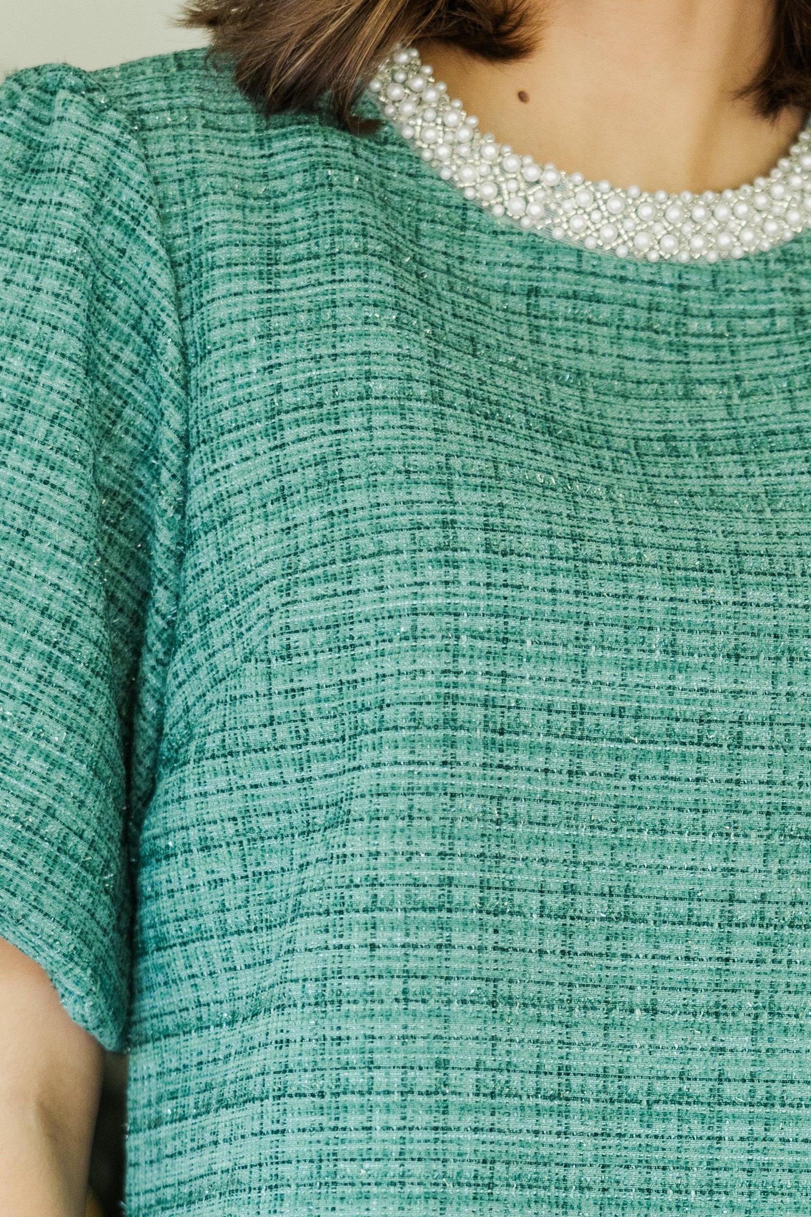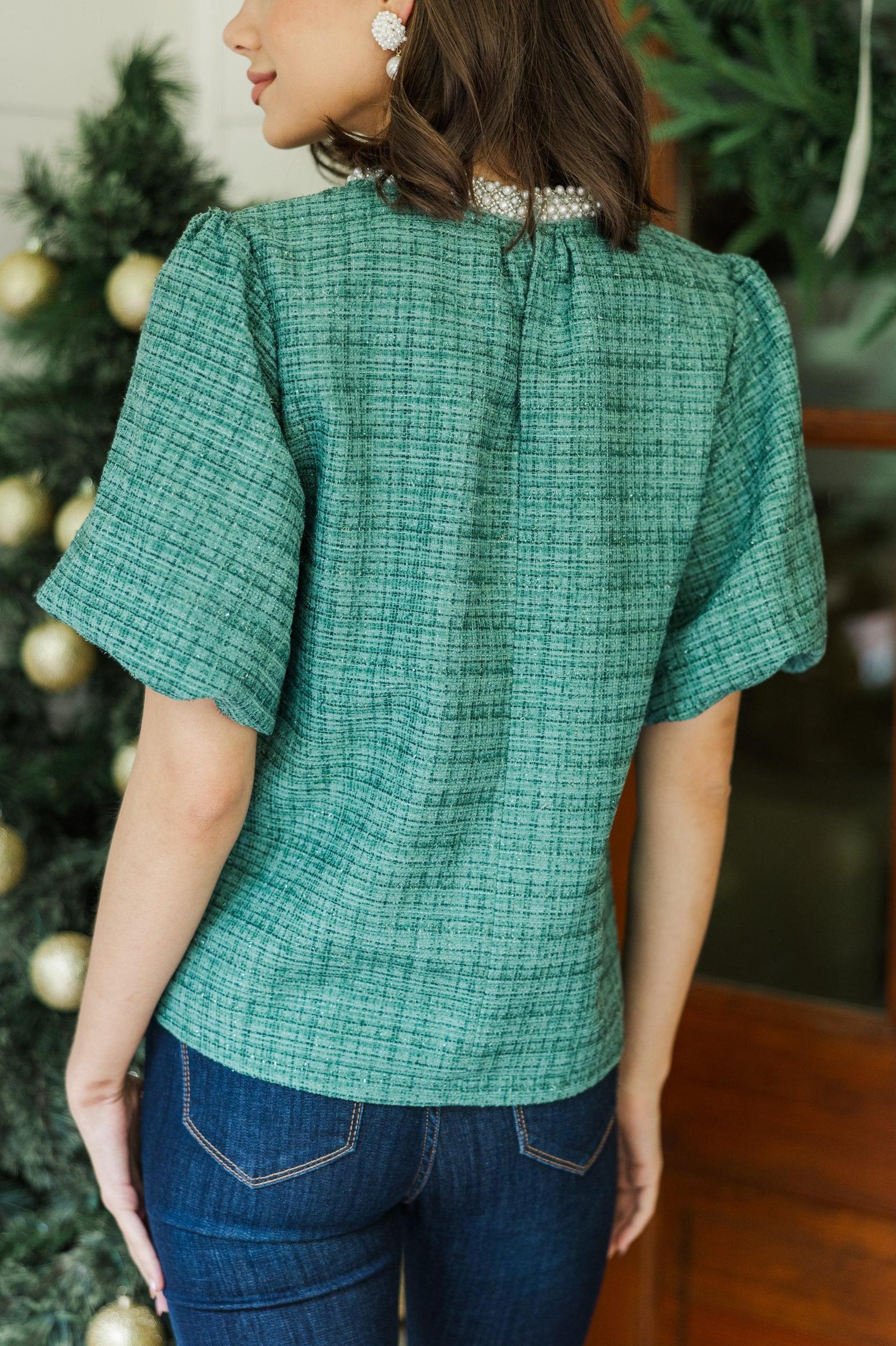 This blouse is wonderfully feminine and classy! That tweed fabric is perfect for the season and we couldn't love that pearl embellished neckline more! This blouse is going to style so well for work or weekends! Round neckline Button keyhole back Pearl embellishments Short bubble sleeves Tweed fabric No stretch Savannah is wearing the small.