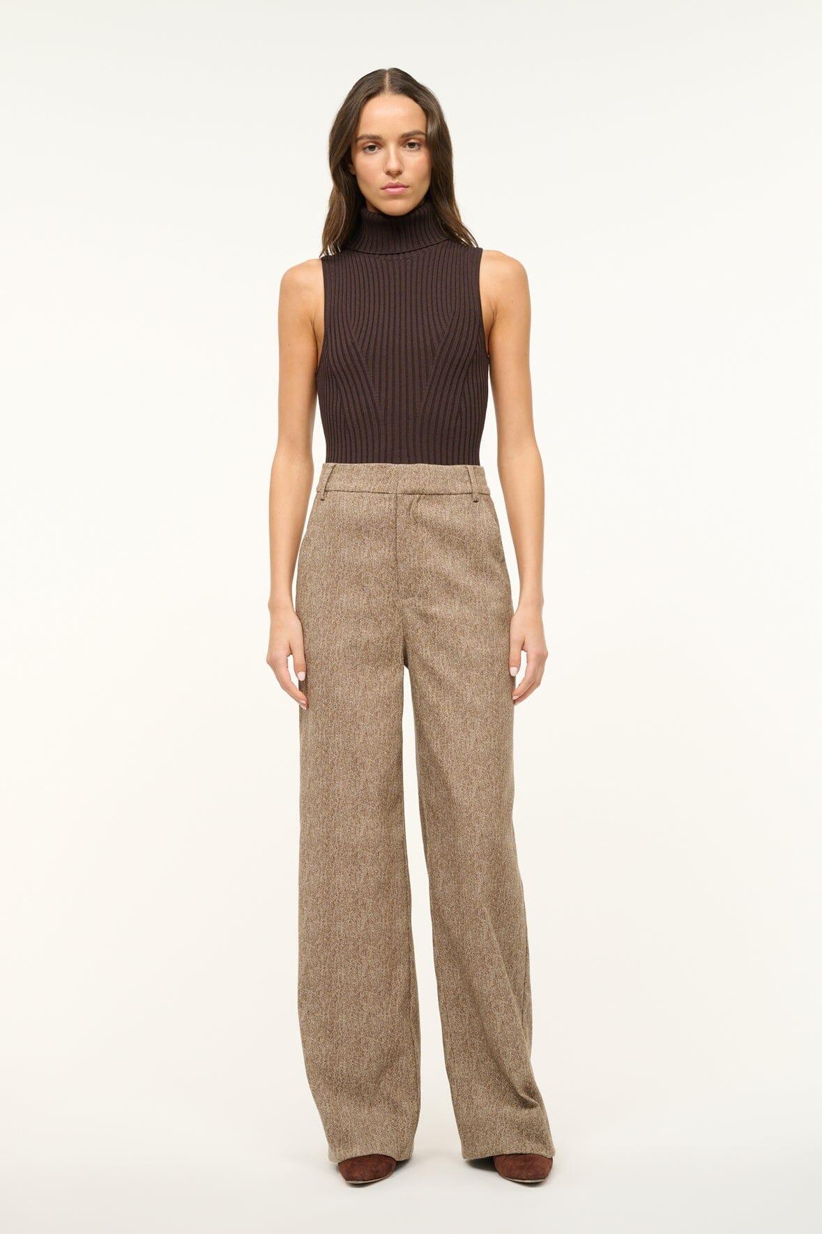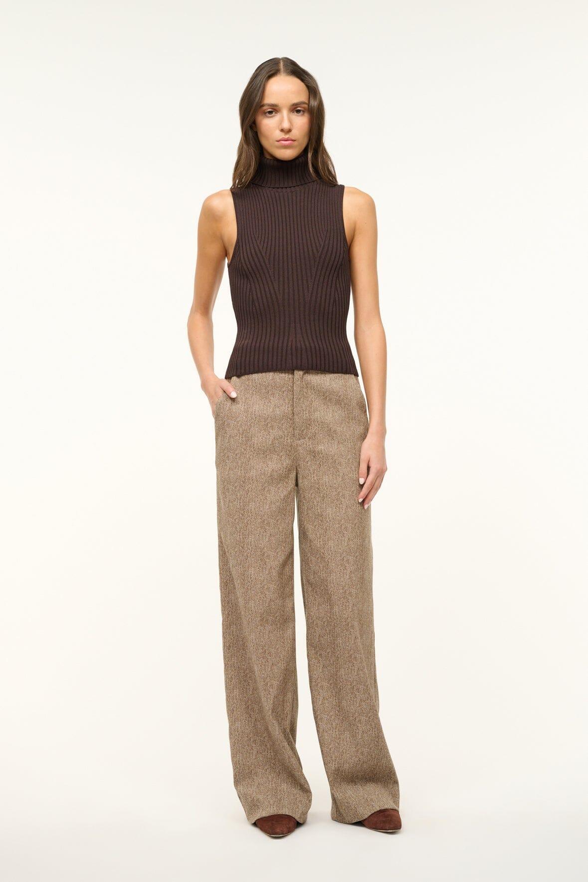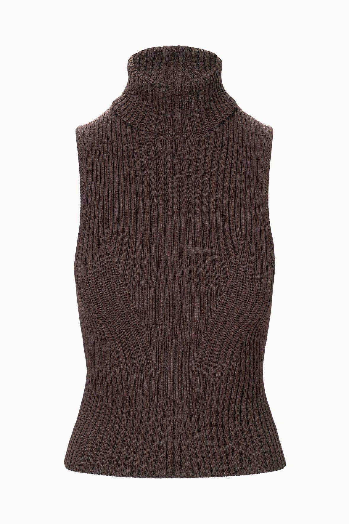 A sleeveless turtleneck top made out of a stretchy rib knit fabric with a fitted silhouette.