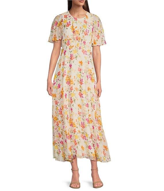 From Calvin Klein, this dress features: Crinkled chiffon fabrication Crew neckline Short sleeves Lined Floral print Zip back closure Approx. 52.5" in length Polyester Dry clean Imported.