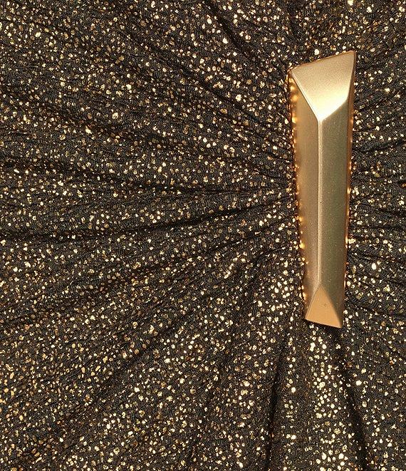 From Calvin Klein, this dress features: Foil glitter knit fabrication V-neckline Long sleeves Faux wrap silhouette Gathered front bodice Hardware applique Lined Center back zipper closure Approx. 38.5" in length Polyester/spandex Dry clean Imported.