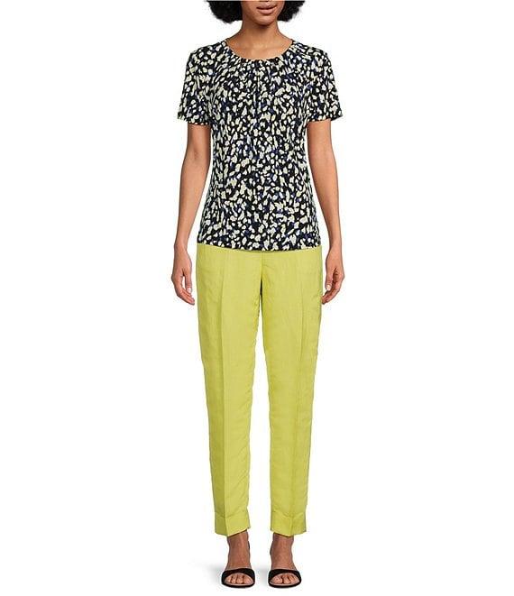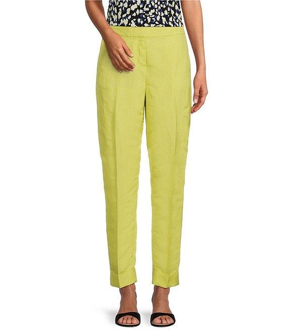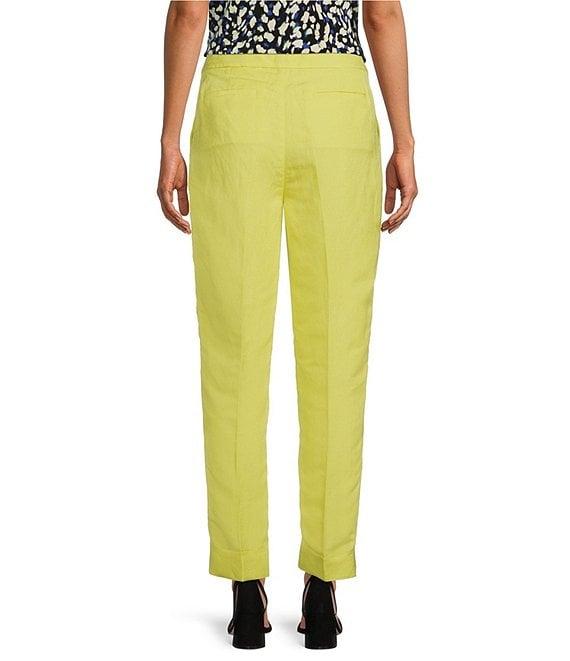 From Calvin Klein Petite, these pants feature:Linen blend fabricationMid-riseSlim straight silhouettepleated frontSide pocketsWelt back pocketsCuffed hemFront hook and zipper closureApprox. 25" inseamLinen/rayonDry cleanImported.