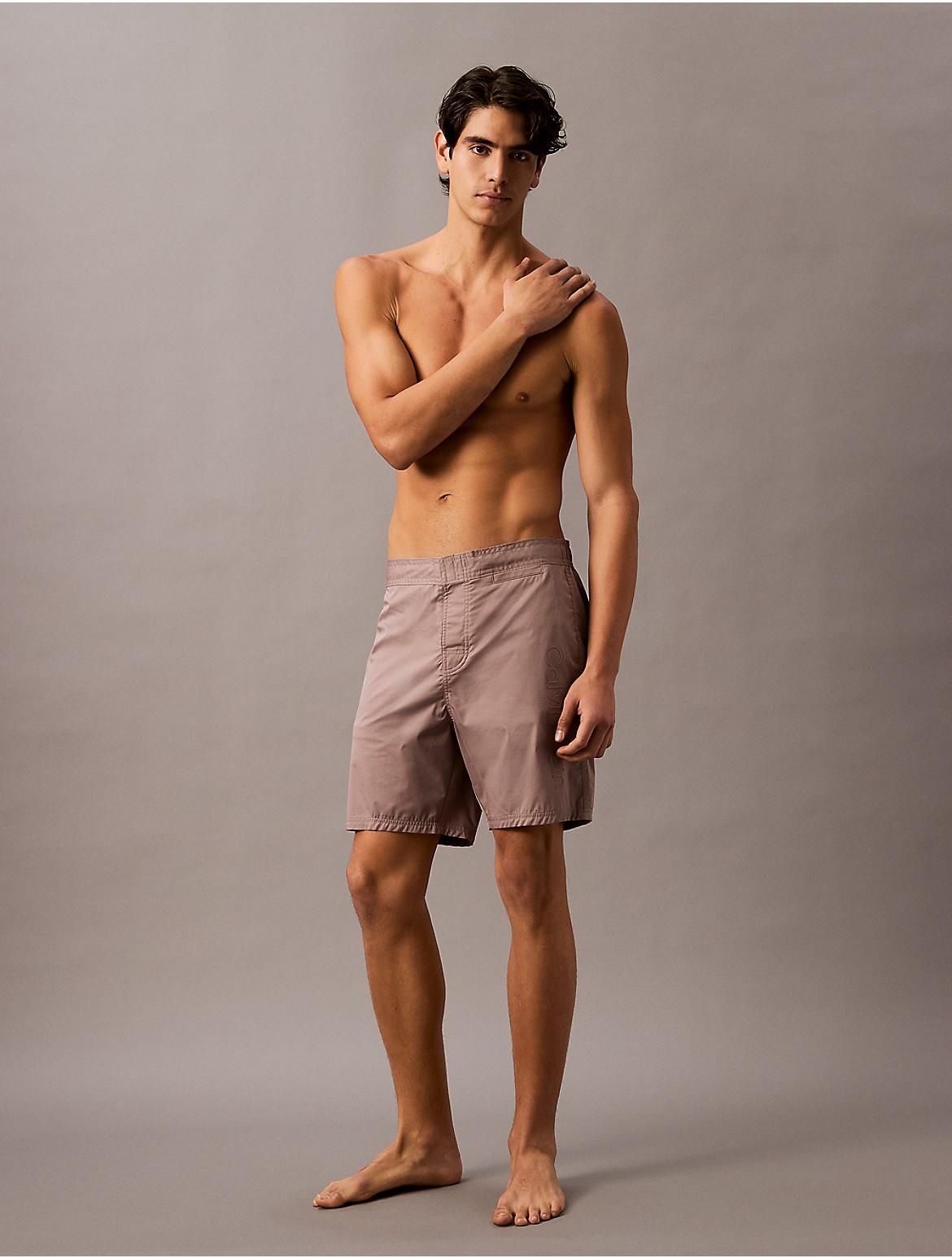 Crafted from a cotton stretch blend for swimwear comfort, these board shorts are cut with a 7 inseam. Finished with a velcro closure at the waistband and an embossed Calvin Klein logo. Material: 62% Cotton, 35% Polyamide, 3% Elastane.
