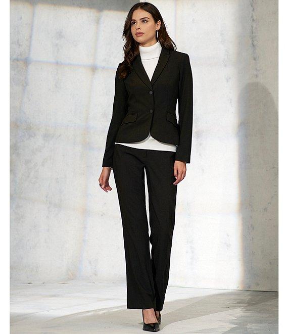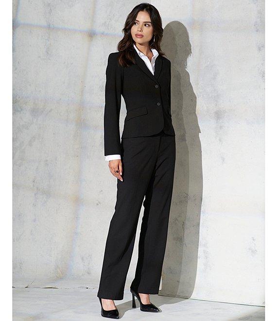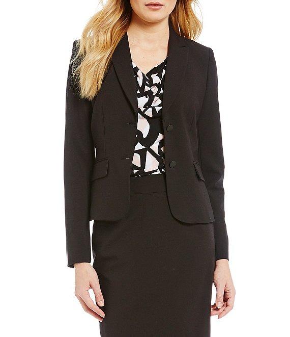 From Calvin Klein, this jacket features: luxe stretch seasonless fabrication notch collar padded shoulders front seaming detail for shaped fit functional front flap pockets and side pockets back vent for comfort and fit2-button front closure with signature logo detail approx. 23" center back length polyester/rayon/spandex; full polyester lining dry clean Imported.
