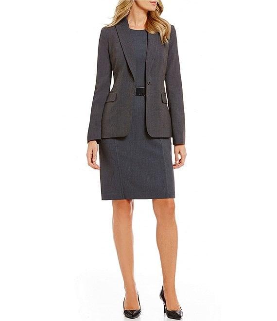 From Calvin Klein, this jacket features: notch lapel long sleeves front flap pockets one button front closure approx. 26" long from center back polyester/rayon/spandex dry clean Imported. From Calvin Klein, this women's jacket is chic and sophisticated. A button-front closure and notch collar provide shape and create a flattering silhouette.