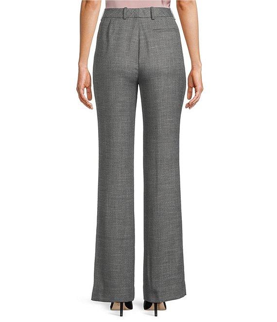 From Calvin Klein, these pants feature: Novelty fabrication High waisted Modern fit silhouette Belt loops 2 functional pockets at hips/ 1 back slip pocket Front button and zipper closure Approx. 32.5" inseam, 10.5" front rise, 14.125" back rise Polyester/rayon/spandex Dry clean Imported.