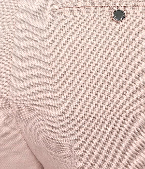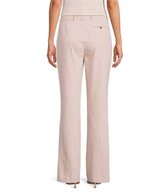 From Calvin Klein, these pant features: Novelty fabrication Flat front silhouette Mid rise Straight leg Two front side pockets One back pocket Belt loops Modern fit Button front jook & bar/zip closure Approx. 32.5" length Polyester/rayon/spandex Dry clean Imported.