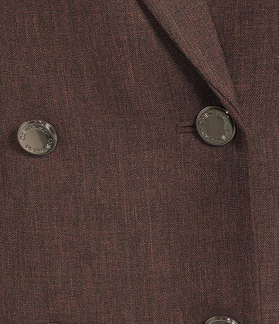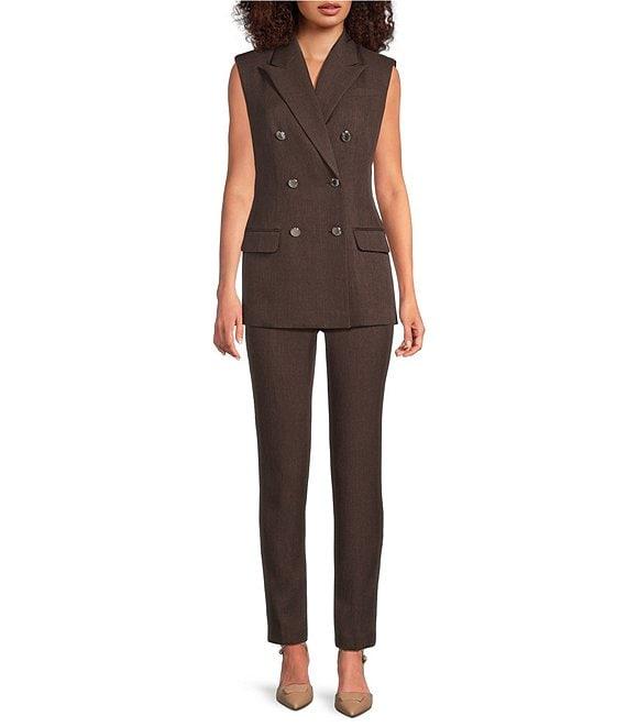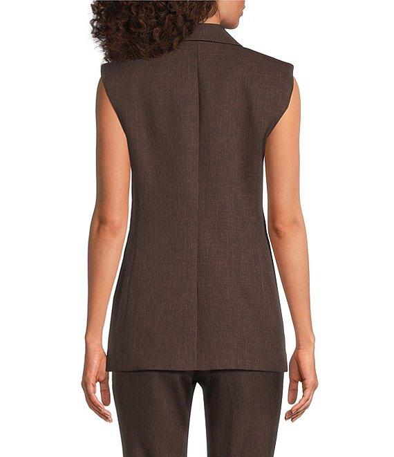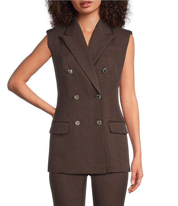 From Calvin Klein, this vest features: Novelty double breasted fabrication Peak lapel collar Sleeveless Two non-functional front-side pockets Non functional chest pocket Lined Straight hem Double breasted button closure Approx. 27.5" length Polyester; lining: polyester Dry clean Imported.