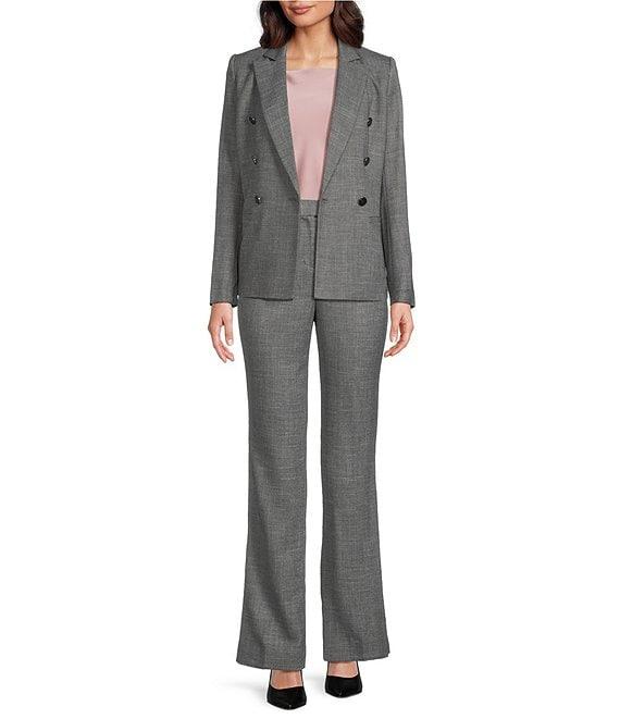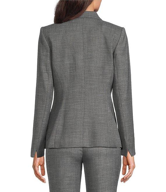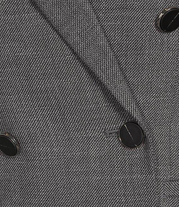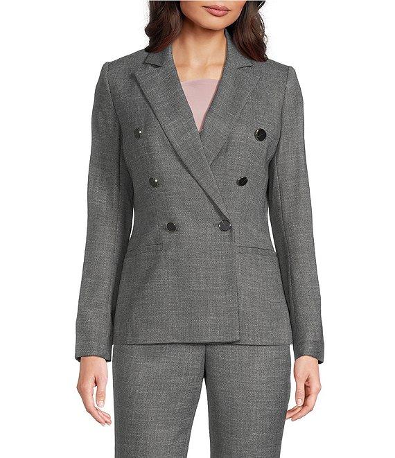 From Calvin Klein, this jacket features: Novelty fabrication Peak lapel collar Long sleeves Two non-functional front-side pockets Non functional chest pocket Double breasted button closure Approx. 25" length Polyester/rayon/spandex Dry clean Imported.