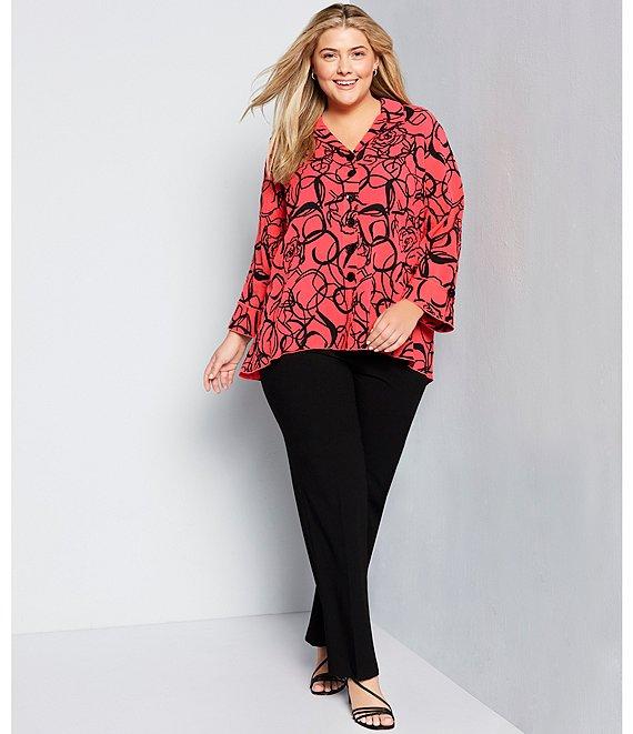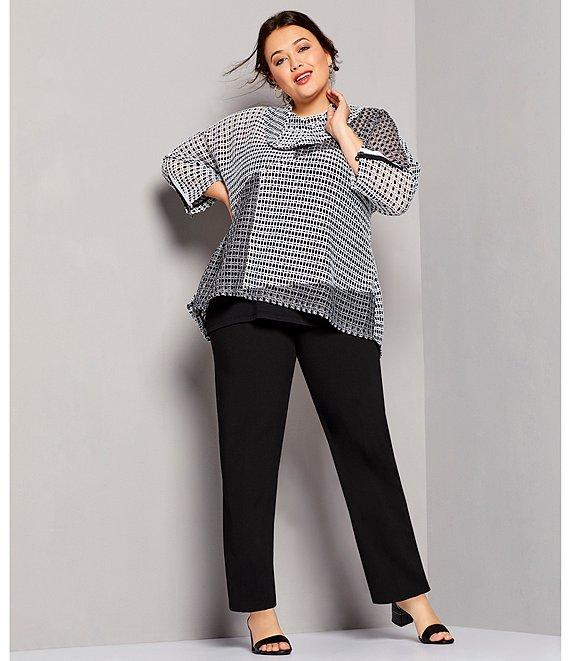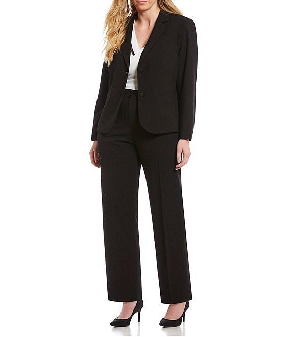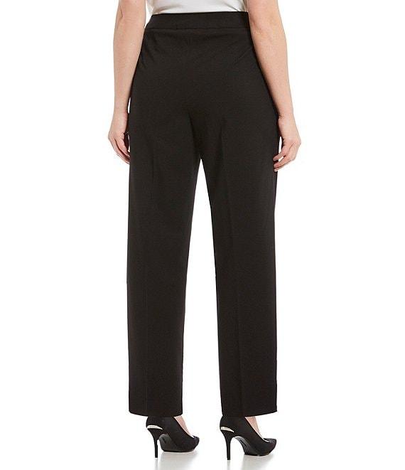 From Calvin Klein Plus, these pants feature: Tapered leg silhouette button and zip fly closure Fitted at hip and thight approx. 32" inseam polyester/rayon/spandex dry clean Imported.