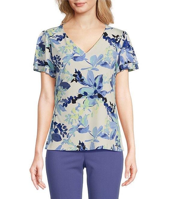 Calvin Klein Printed Matte Jersey V-Neck Flutter Sleeve Blouse
