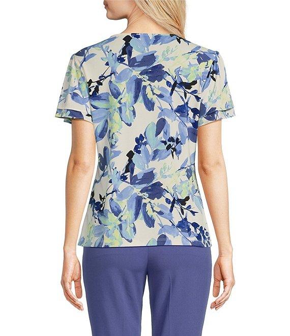 From Calvin Klein, this blouse features: Matte jersey fabrication V-neckline Flutter short sleeves Standard fit Straight hemline Pullover construction Approx. 23.5" length Polyester/spandex Dry clean Imported