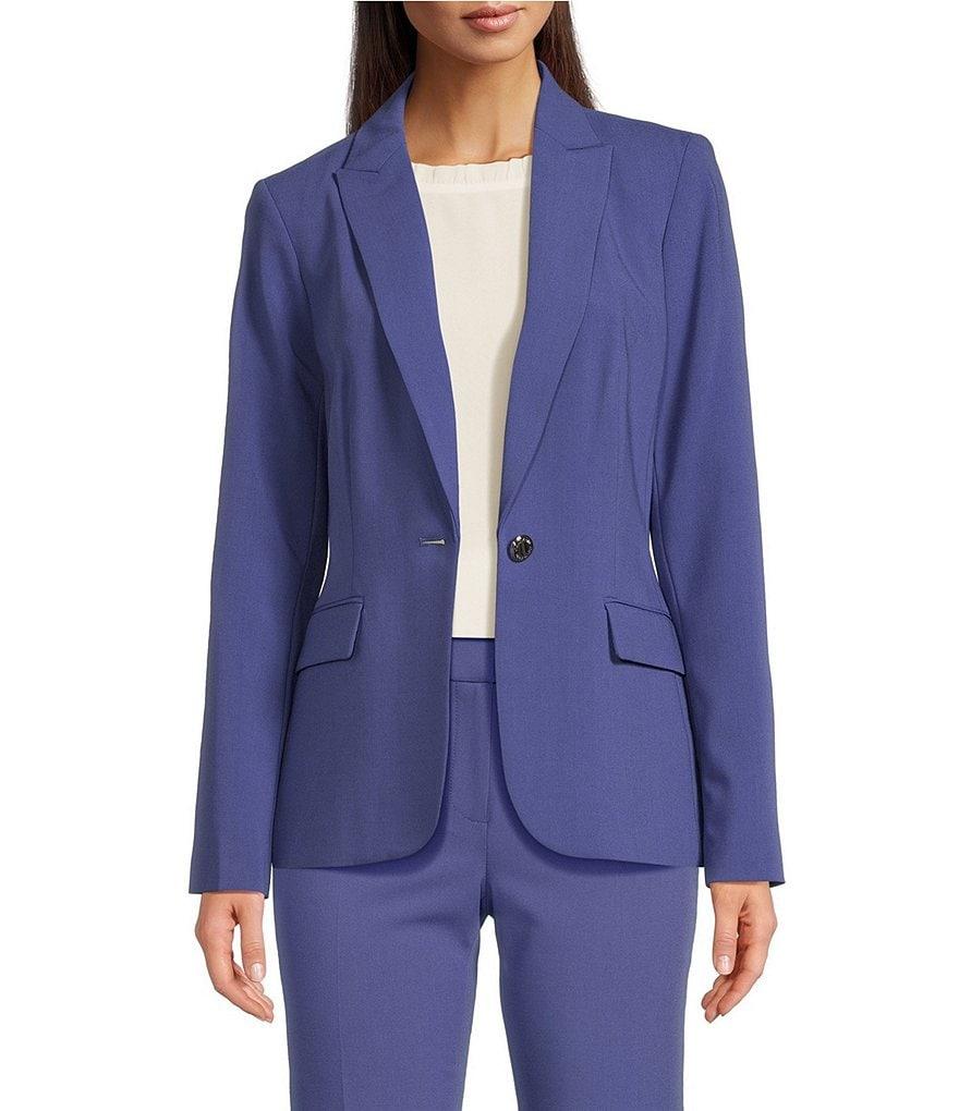 From Calvin Klein, this jacket features: Lux fabrication Peak lapel collar neckline Long sleeves Two front side pockets Hardware button detail Fully lined Straight hemline One button closure Approx. 25.75" length Polyester/recycled polyester/rayon/spandex Dry clean Imported.