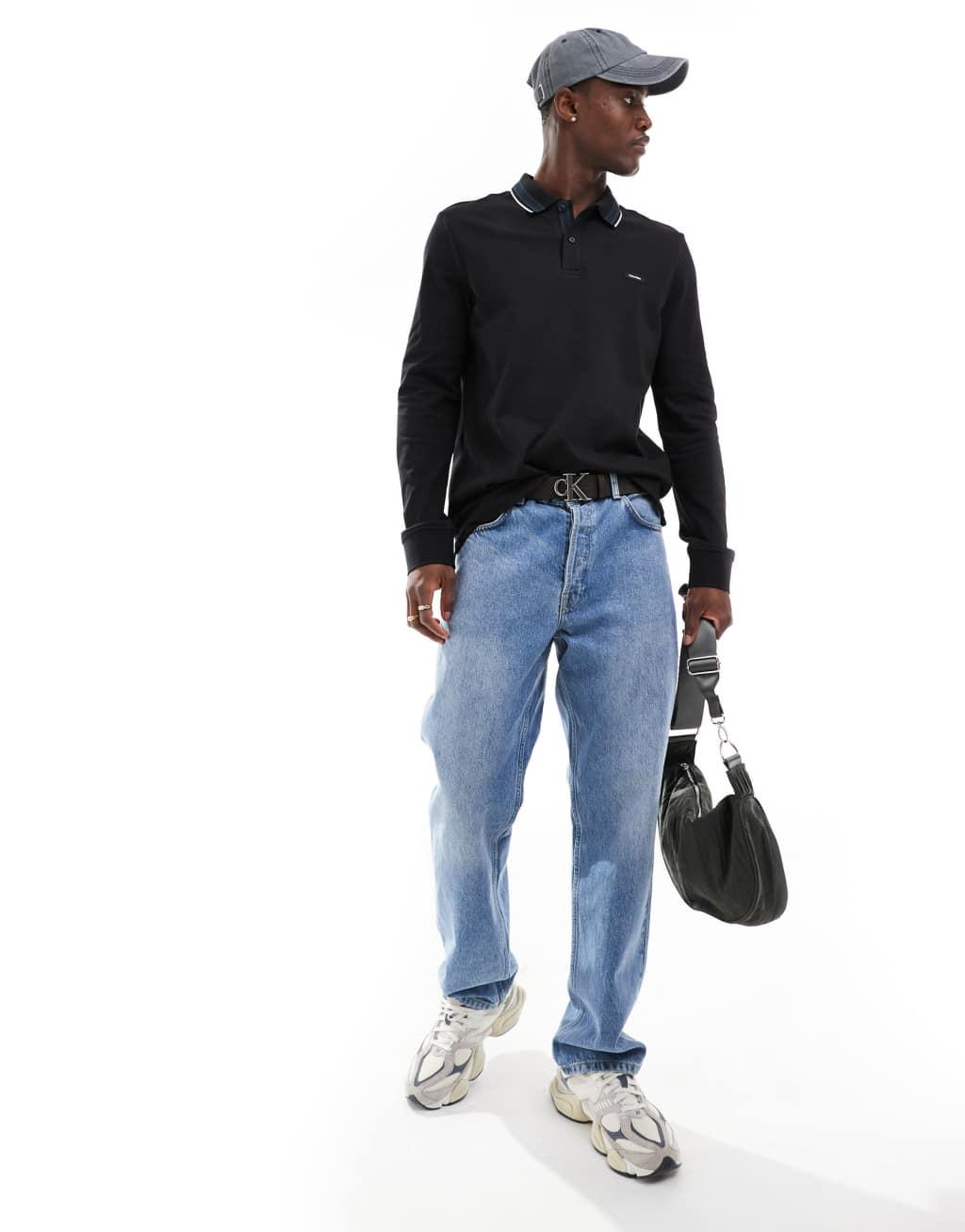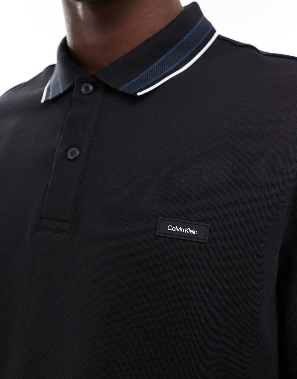 Calvin Klein stretch pique tipped long sleeve polo in black