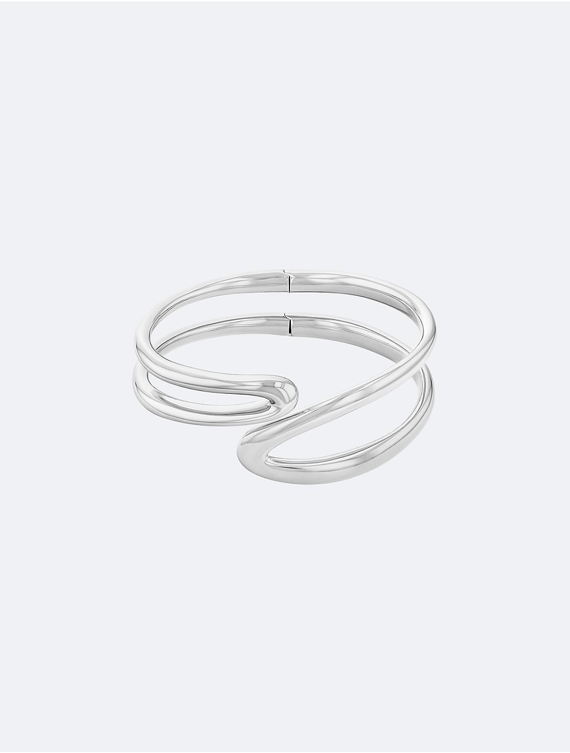 Sculptural links with organic curves. This bangle is distinct in polished stainless steel with a hinge closure.