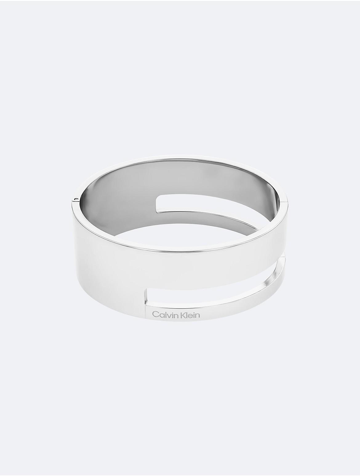 A distinct, sculptural silhouette that reflects the interplay between geometric shaping and negative space. This bangle has a hinge closure and is finished with an engraved Calvin Klein logo. Material: 6.8.