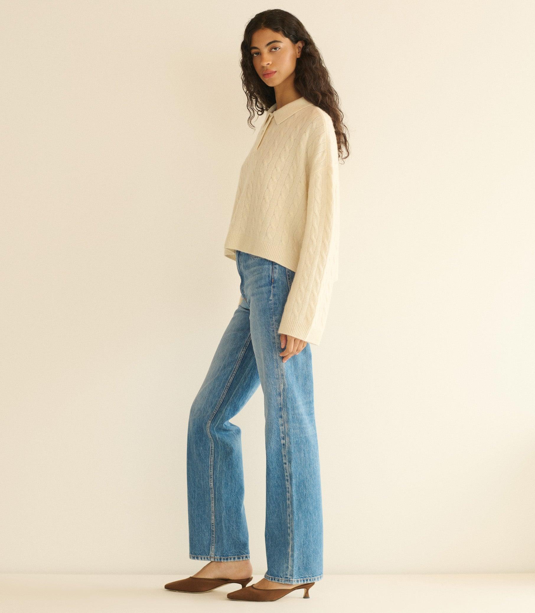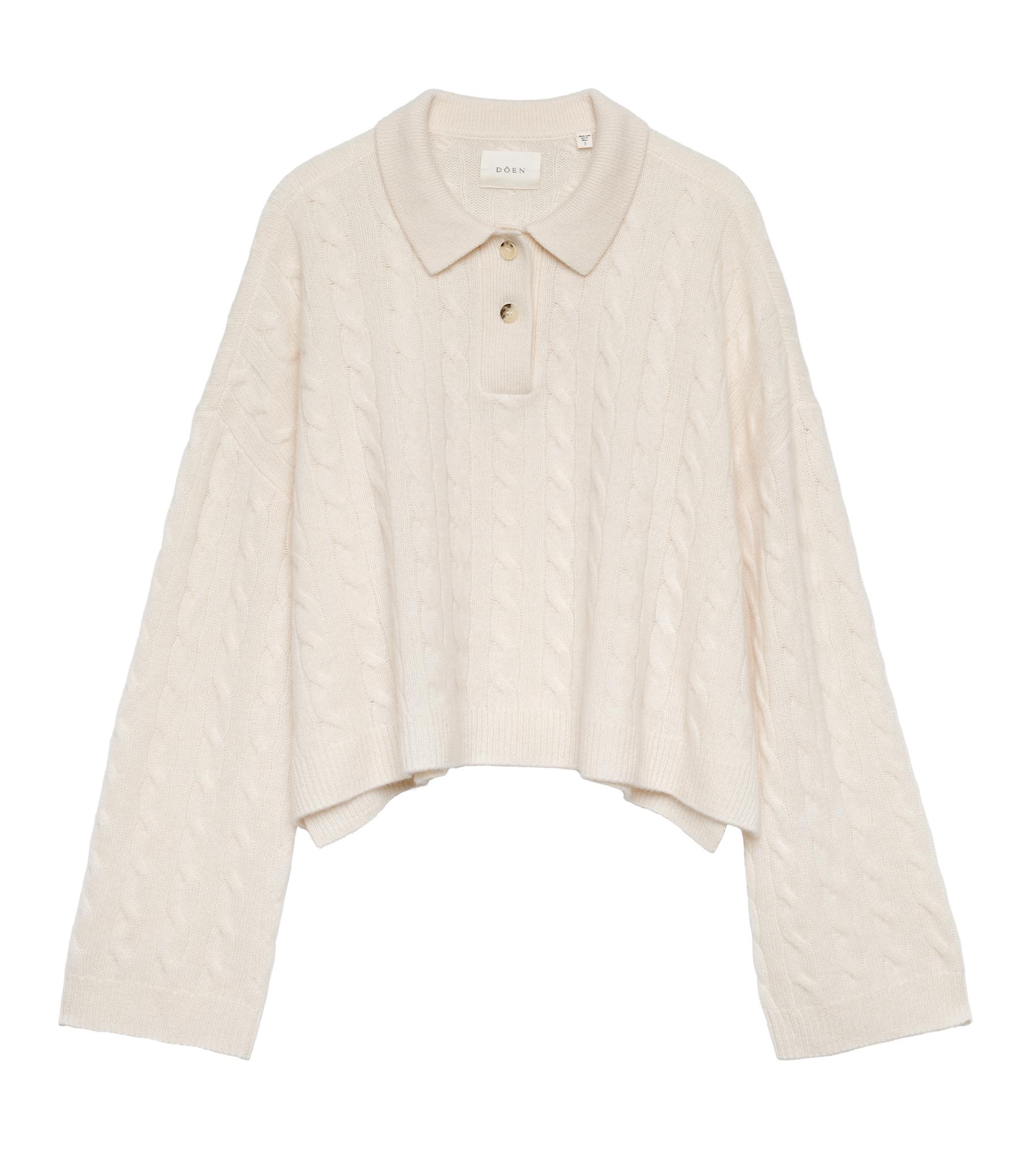Inspired by a vintage sweater, the Cambridge is cable-knitted from soft, 100% cashmere in a boxy, slightly cropped silhouette. Designed with straight, full-length sleeves, it features a Henley-style collar finished with two faux horn buttons.