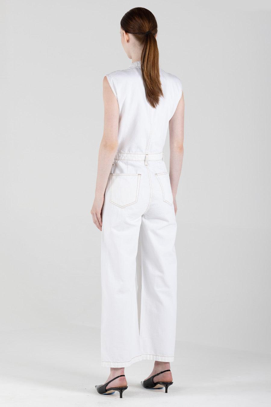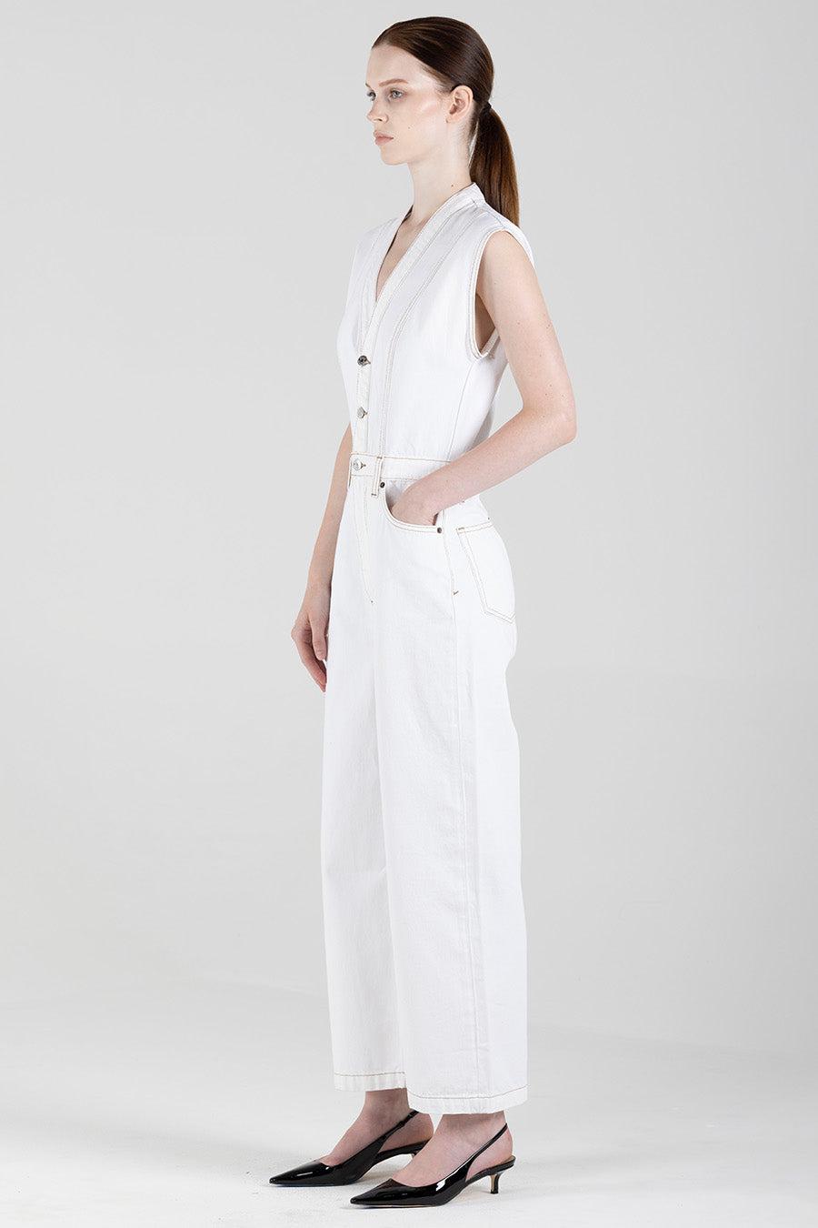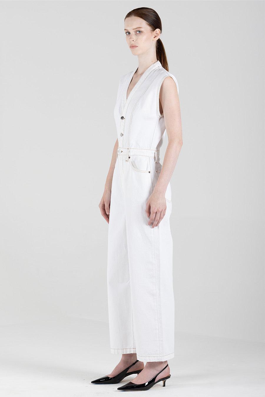 Signature front seaming creates a sharp silhouette for an easy-fitting jumpsuit. A soft, lightweight denim provides a soft drape and vintage appeal.