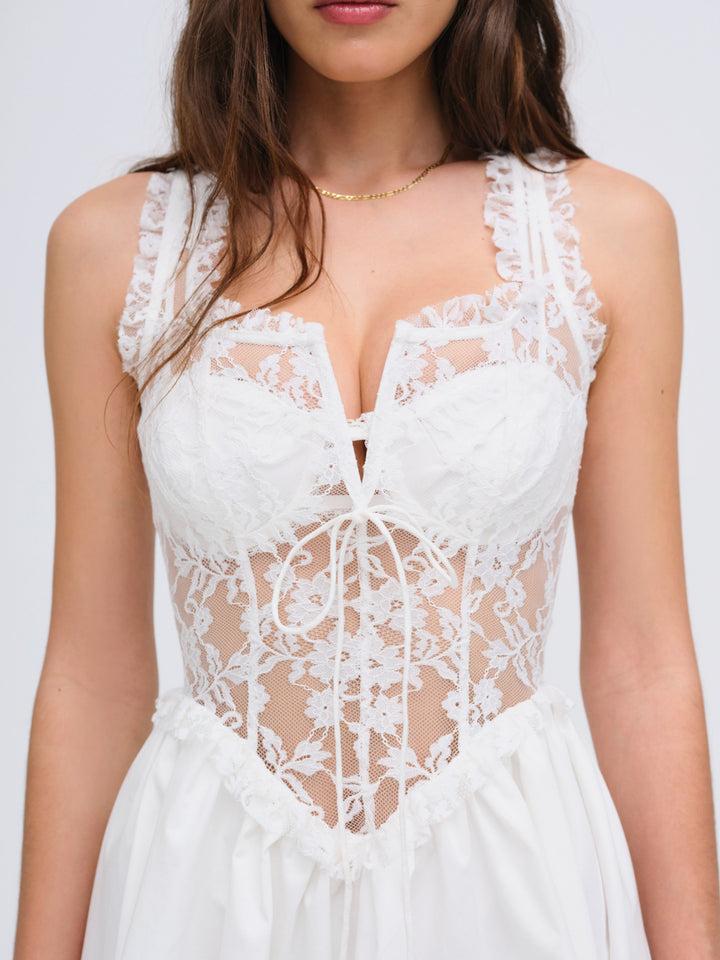 Introducing the Camdyn little white dress—a charming lace mini dress adorned with ruffles throughout. This short dress features a separate poplin bra with lace over-layer, a ""V"" wire at the center-front, and a fully gathered poplin skirt that cuts a feminine silhouette.