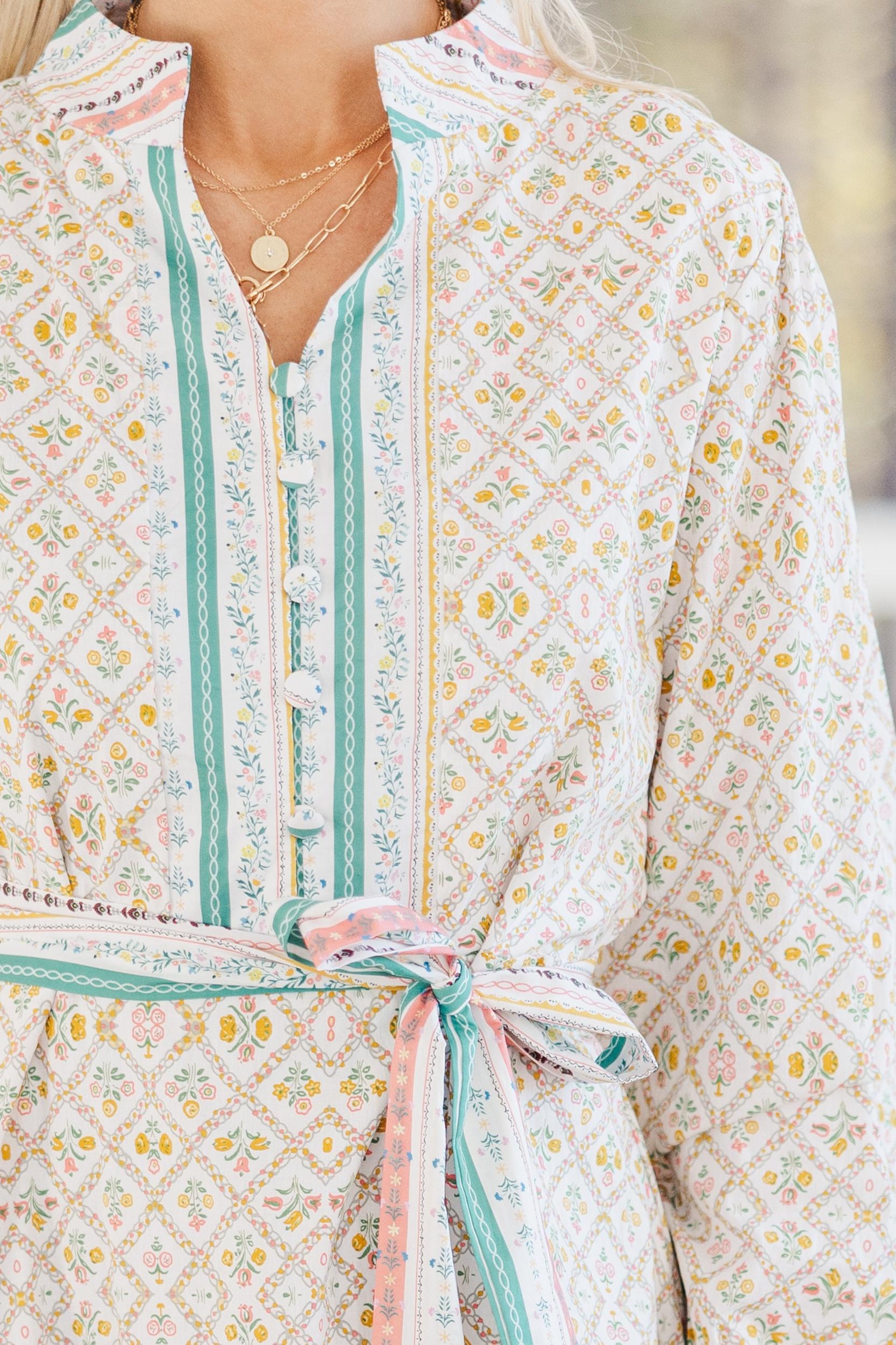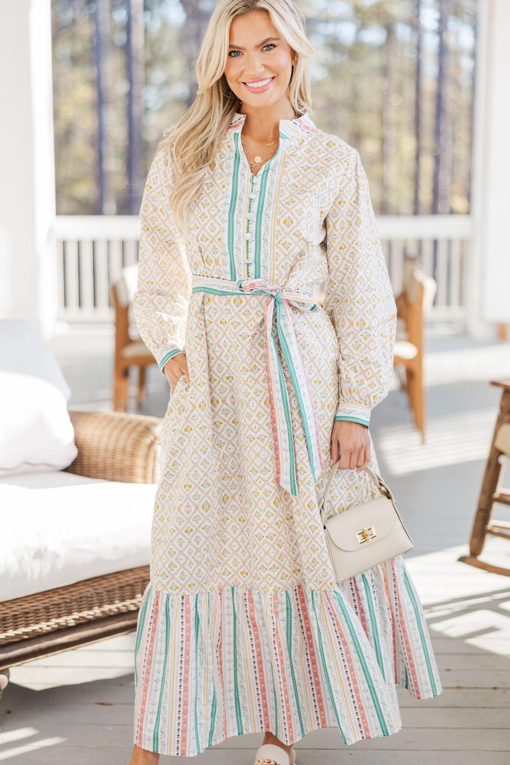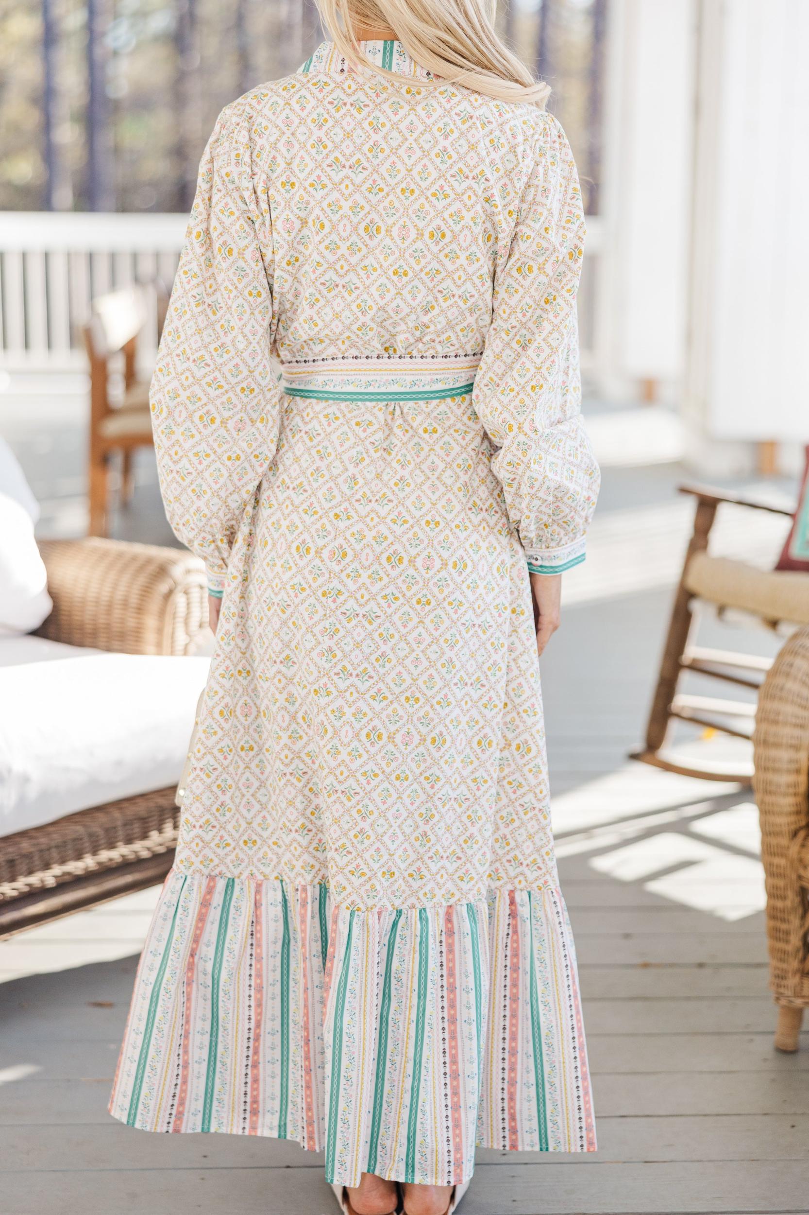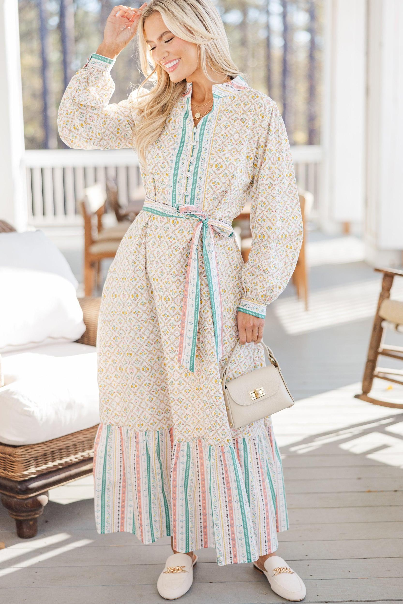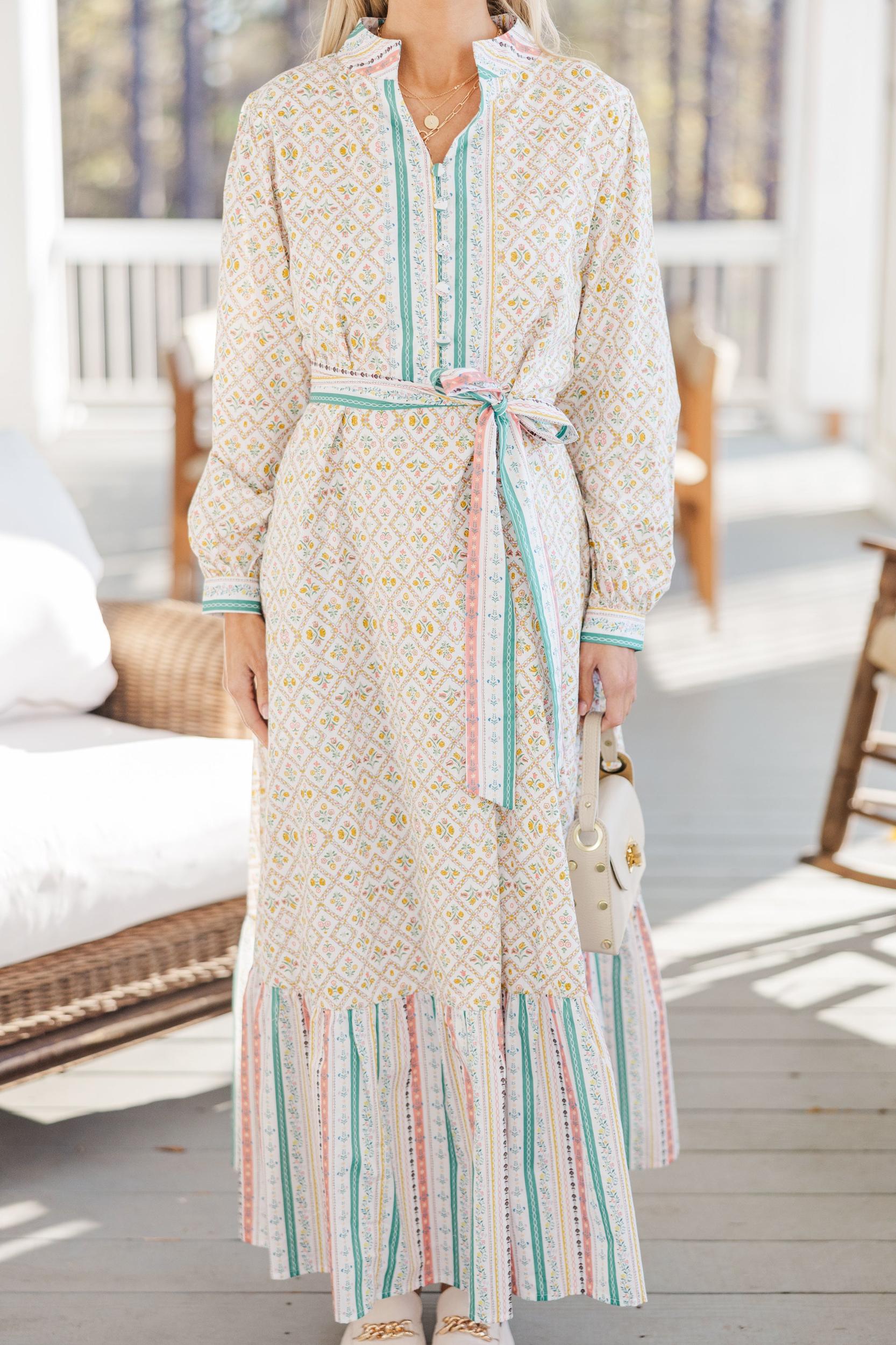 Embrace effortless elegance with this maxi dress! This vintage-inspired beauty features a delicate geometric floral print with soft pastel hues, accented by charming striped details along the trim and hem. The button-front bodice, high ruffled neckline, and waist-defining tie belt add a timeless touch, while the tiered maxi skirt creates a dreamy, flowy silhouette. Whether you're brunching with friends or strolling through a garden, this dress is a must-have for any romantic, feminine wardrobe! Partial button down v-neckline Long bubble sleeves Flattering tied waist Combination striped and floral print Material has no stretch Baileigh is wearing the small.