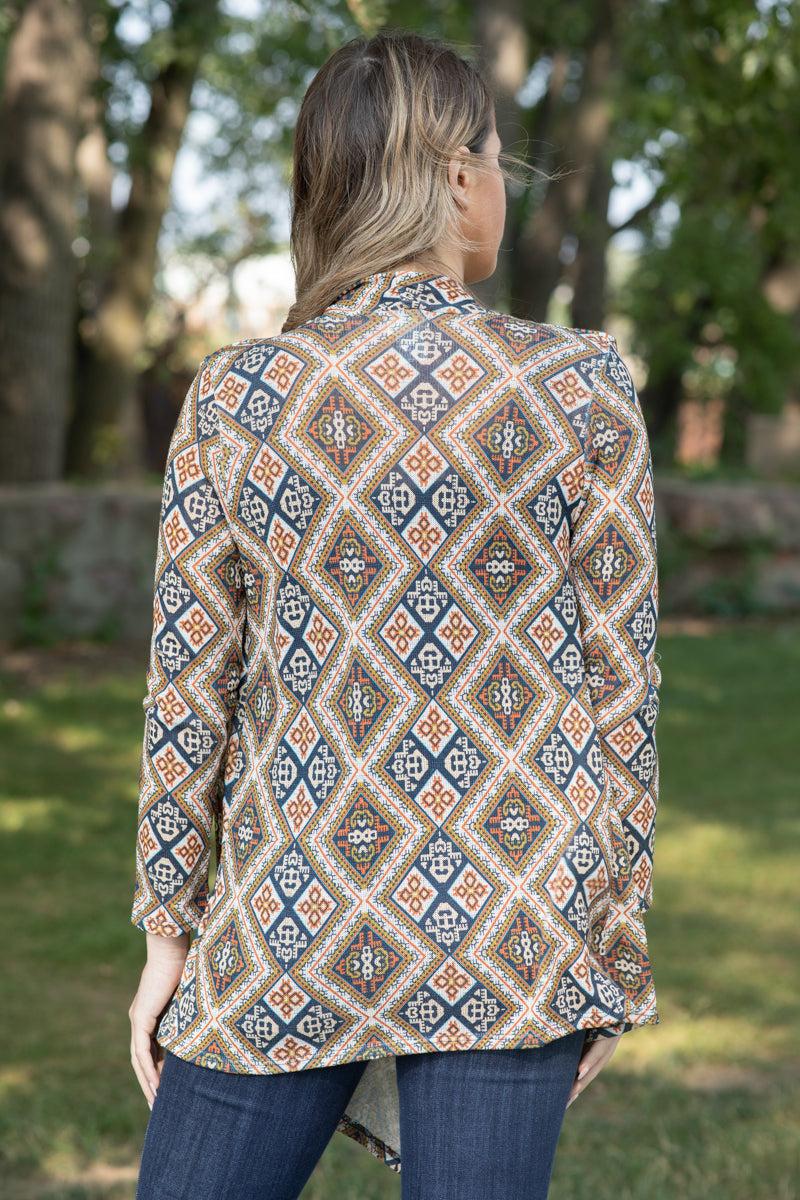 Product Details Colors: Camel, Navy, Teal, Orange, Beige, Off White Print: Aztec Collar: Standard Cardigan Collar Sleeve: Long Sleeves Hemline: Straight Color Season: Autumn Material and Care 95% Polyester 5% Spandex Hand Wash Cold Hang/Line Dry Size and Fit Small: Bust 36" Waist 34" Length 28" Medium: Bust 38" Waist 36" Length 28.5" Large: Bust 40" Waist 38" Length 29" Model is 5'9 and wearing a size small