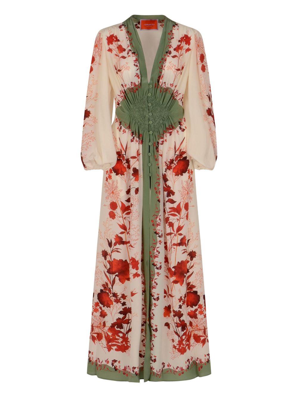 La DoubleJ Camerino silk maxi dress | Neutrals | multi-color | floral print | smocked bodice | button front | Silk | Day Dresses | Dresses | Clothing | Women