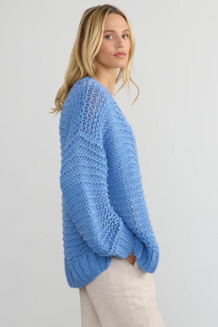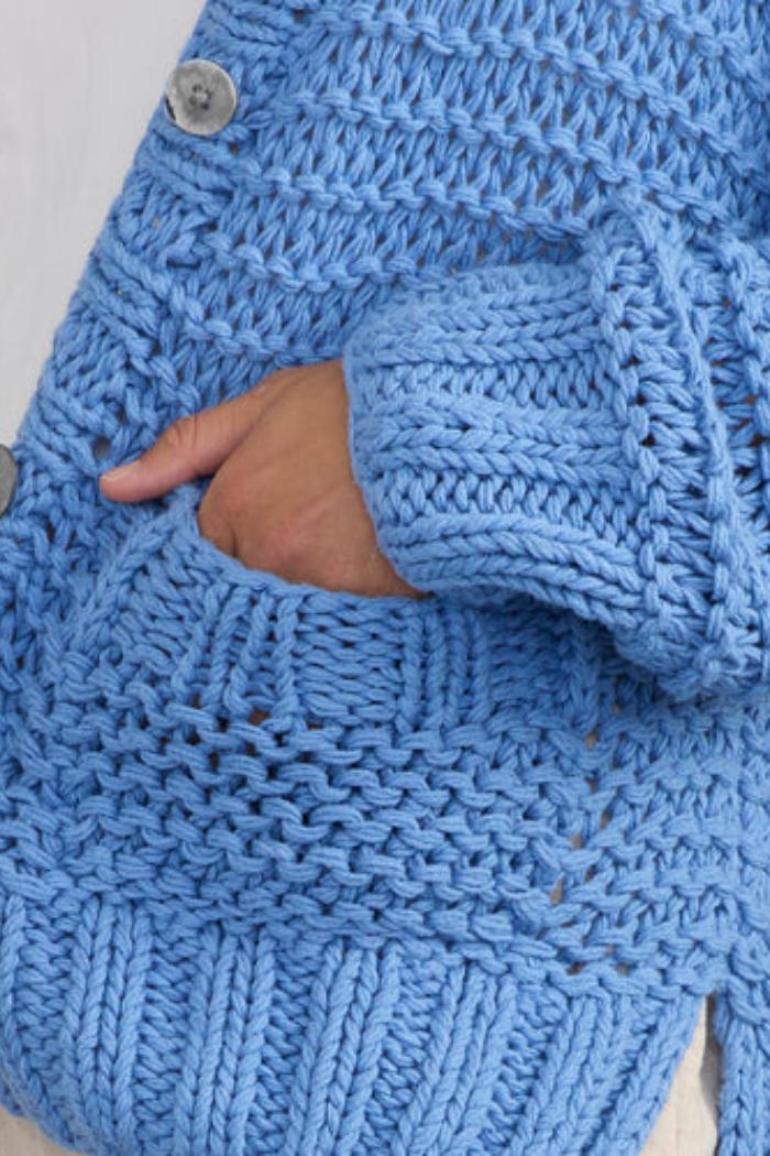 Camila is a relaxed-fit cardigan, perfect for warm days and cool nights! With its chunky 100% cotton yarn and open-knit structure, it's breathable while maintaining an appealing weight and drape. Hand-knit in an allover garter stitch by skilled women artisans in Peru. Features ribbed bands at the cuff, button placket and hem, a cute, functional patch pocket, and coconut shell buttons for a look that is pure weekend bliss.