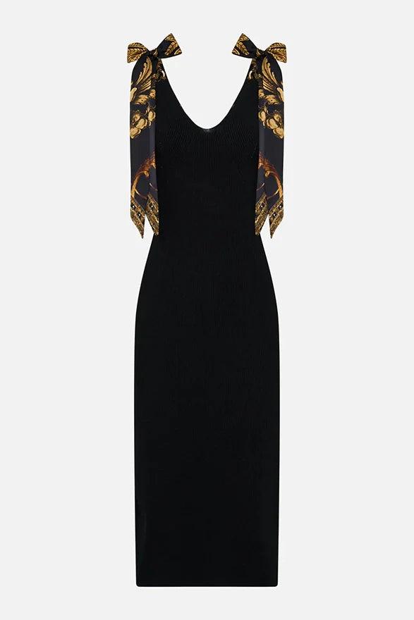 Designed in Australia, The Era Of Empires Long Knit Dress With Silk Ties blends architectural splendor with echoes of classical antiquity and hieroglyphs against a backdrop of decadent black and luminous gold. Lovingly handcrafted, this exquisite knit dress showcases true knit craftsmanship, adorned with striking O-ring hardware, printed silk straps, and dazzling crystal embellishments, blending luxurious textures with radiant, sophisticated detail.