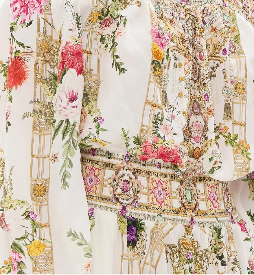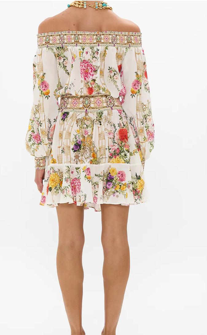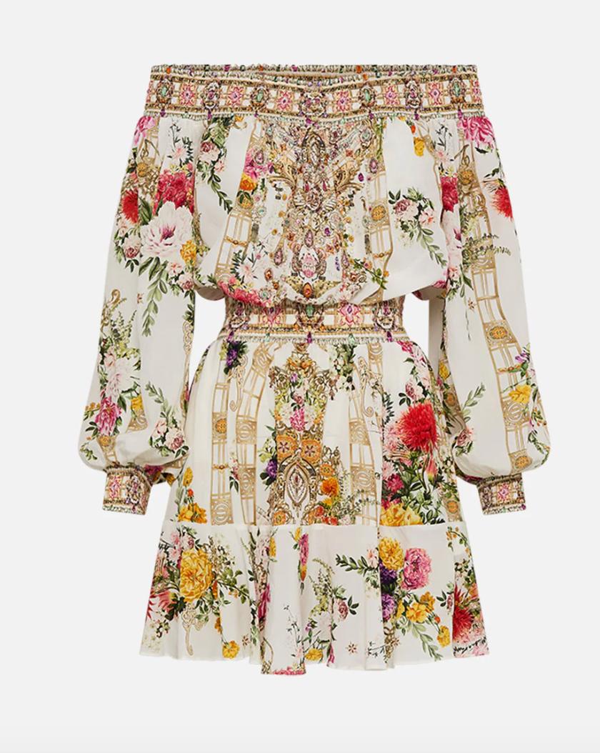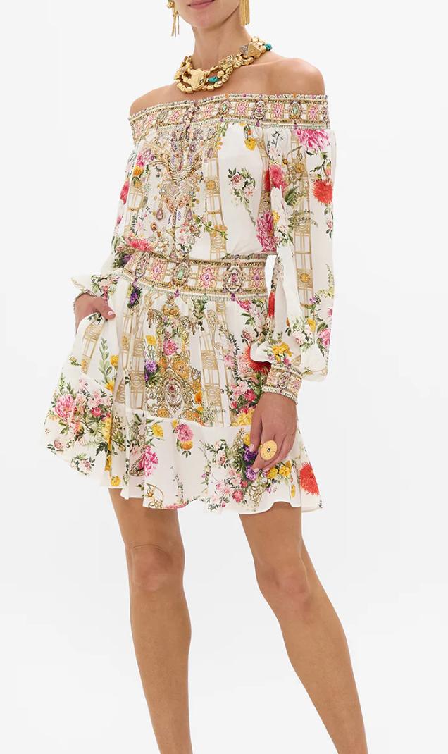 Designed in Australia, The Egyptian Rose Off Shoulder Short Dress captures an enchanting oasis where lush florals entwine with majestic interiors amid a serene, pearlescent setting. Lovingly handcrafted, this luxury silk off-the-shoulder dress features a shirred elastic neckline that falls into a blousy bodice, elegantly cinching into an adjustable waistband. The soft gathered skirt flares into a wide ruffle hemline that dances playfully at mid-thigh level.