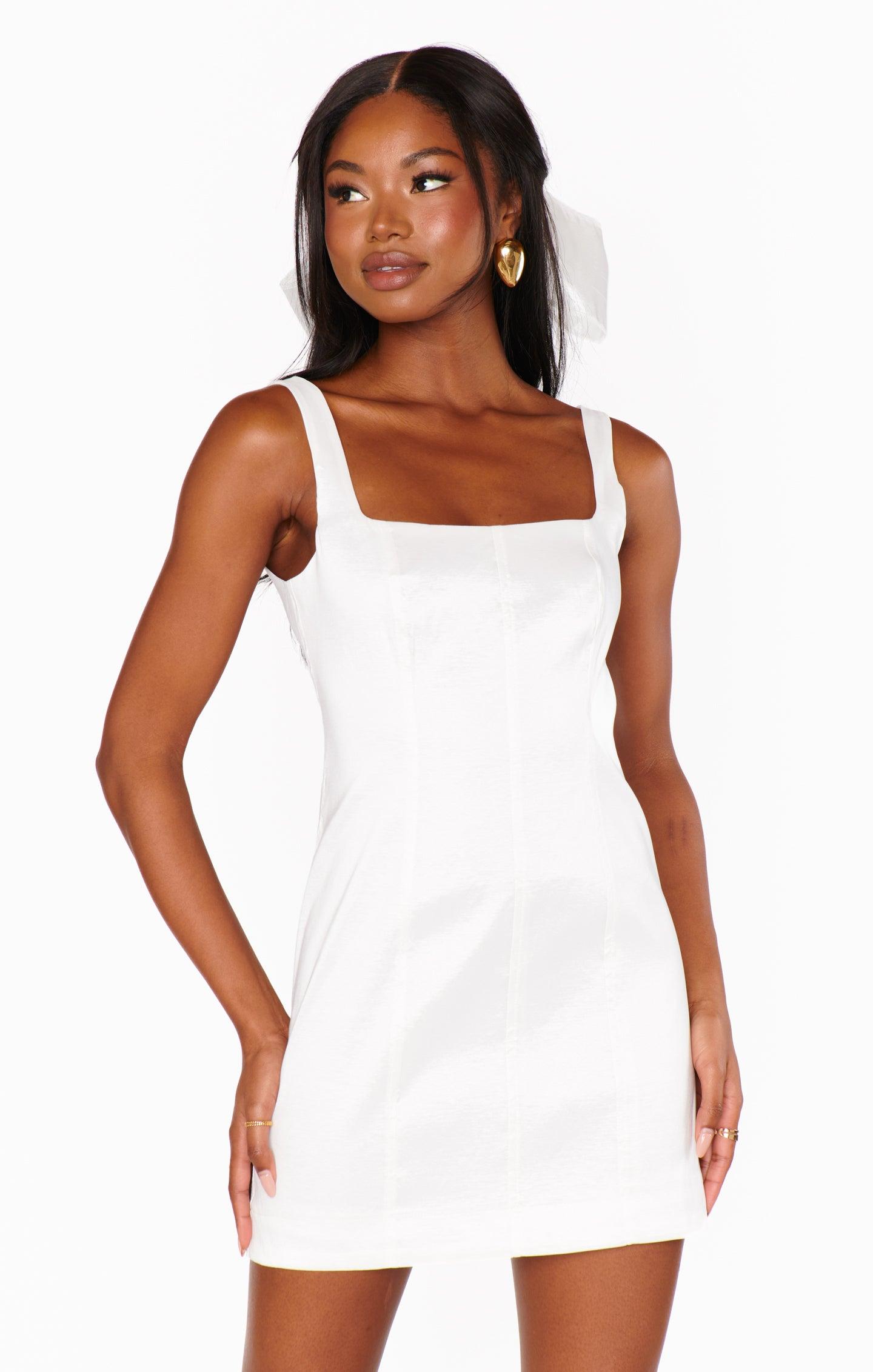 FIT TIP: This is our shorter mini dress length (xxs-xxl)Capture everyone's attention with the elegant Camille Mini Dress in White Taffeta! This mini is the perfect addition to your bridal wardrobe. Accessorize with dainty jewelry and matching heels.
