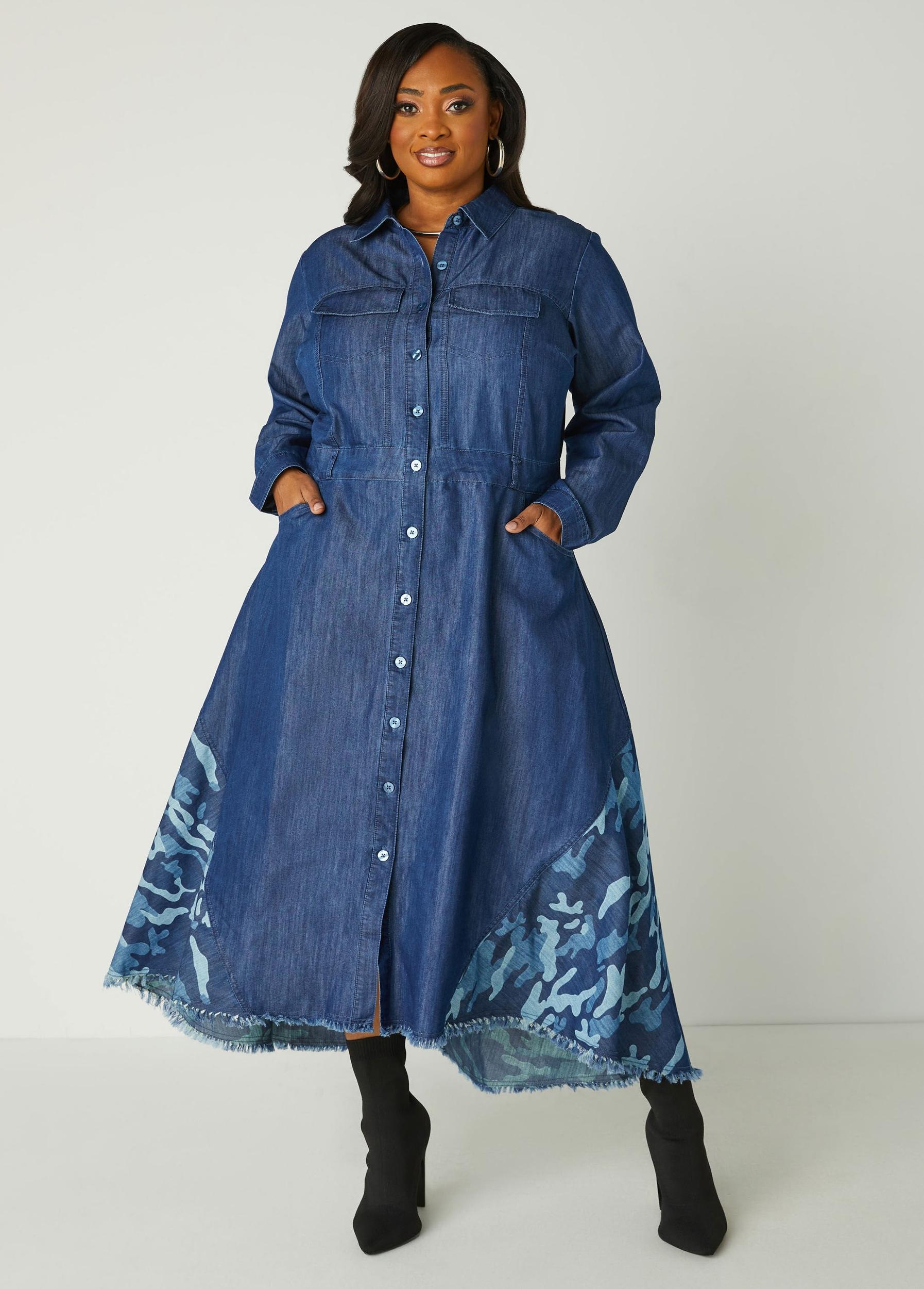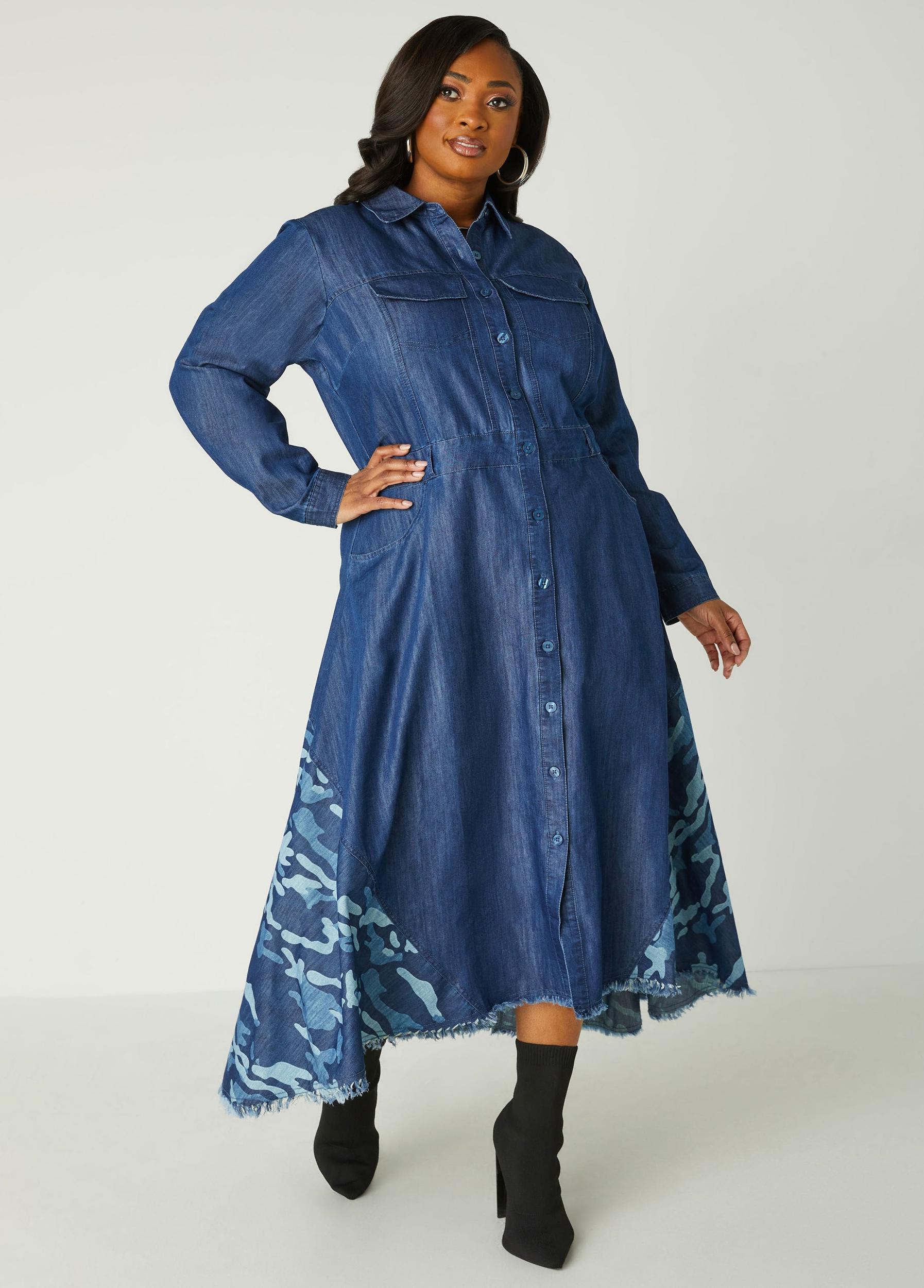 This denim maxi shirtdress blurs the lines between a classic aesthetic & trendy style. The two flap pockets at the bust and slant pockets at the sides add functionality, while button-fastening sleeve cuffs and frayed trims bring a touch of rugged charm. A striking camo print panel at the a-line hem infuses a bit of attitude, making this dress a standout. Effortlessly cool and ready for any adventure, it’s the perfect piece to make your mark.