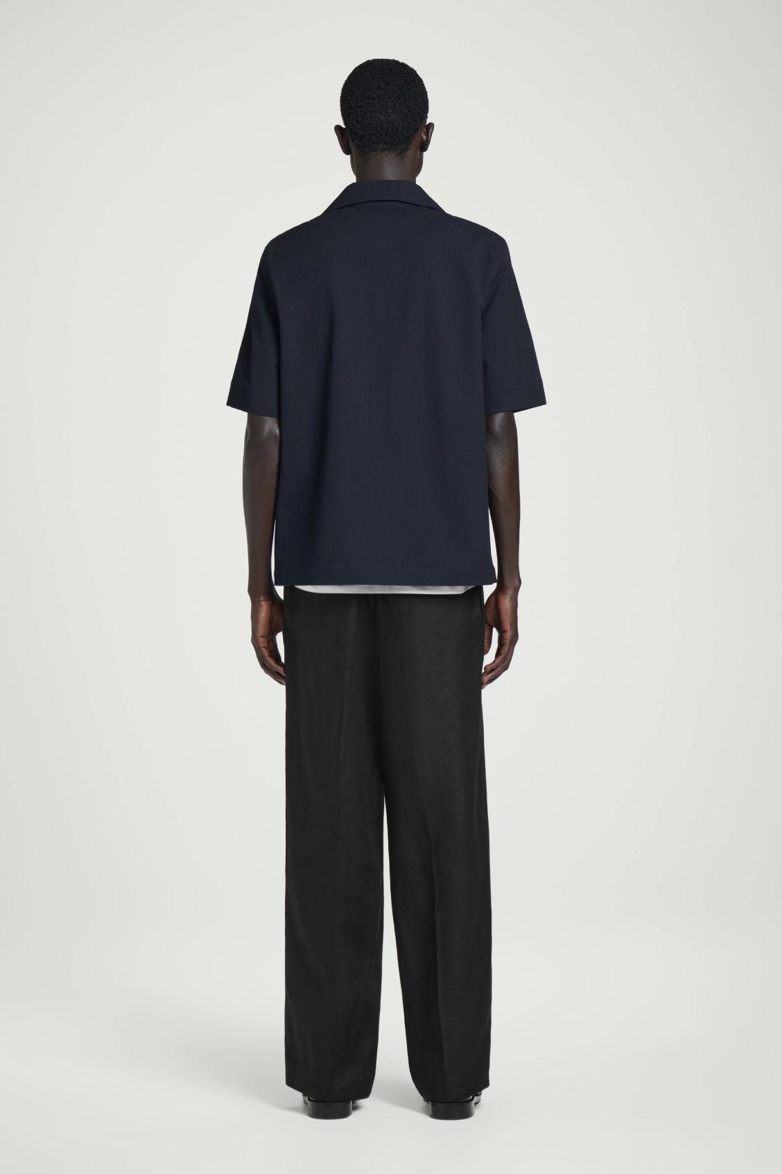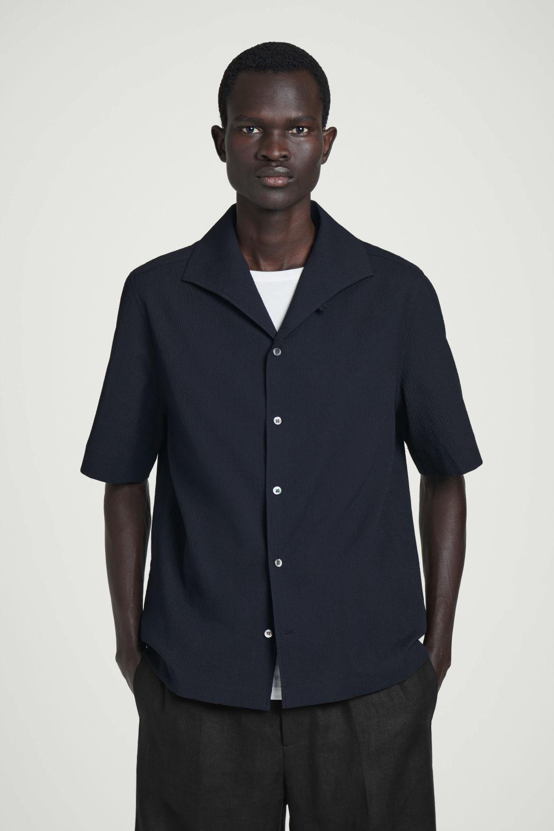 Dynamic textures take centre stage in the menswear collection. Crafted from rippled cotton-blend seersucker, this modern shirt is designed with short sleeves, mother-of-pearl closures and a camp-collar that can be styled buttoned up for a more classic look. Regular fitButton closureRecycled polyester is polyester made from PET bottles or end-of-life textile waste. The PET bottles or textile waste is mechanically recycled and processed into new yarn Shell: 68% Cotton, 31% Recycled polyester, 1% Elastane. Excluding trims / Machine wash Back length of size M is 70cm / Model wears a size M