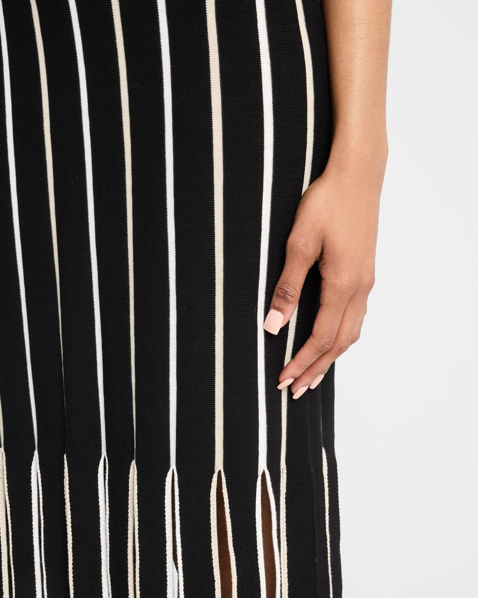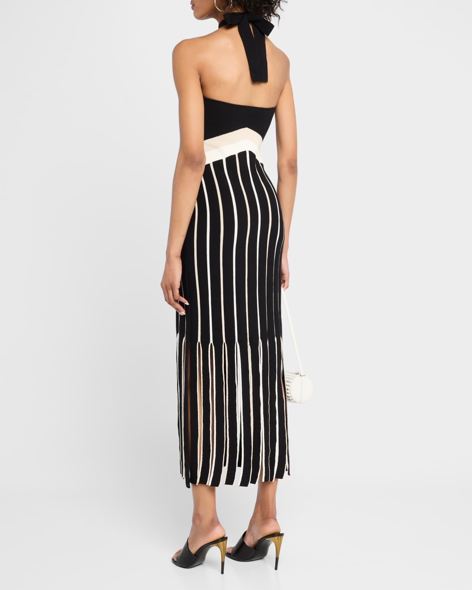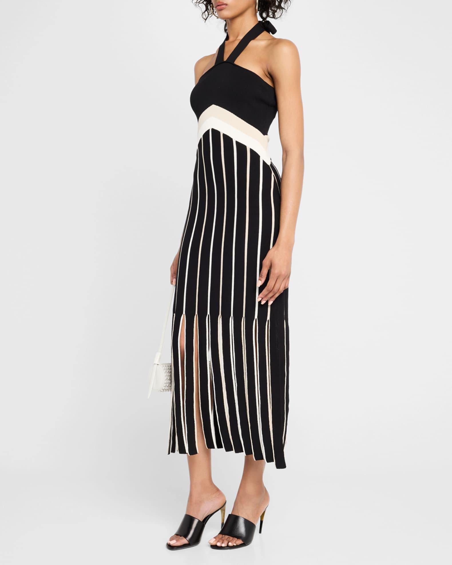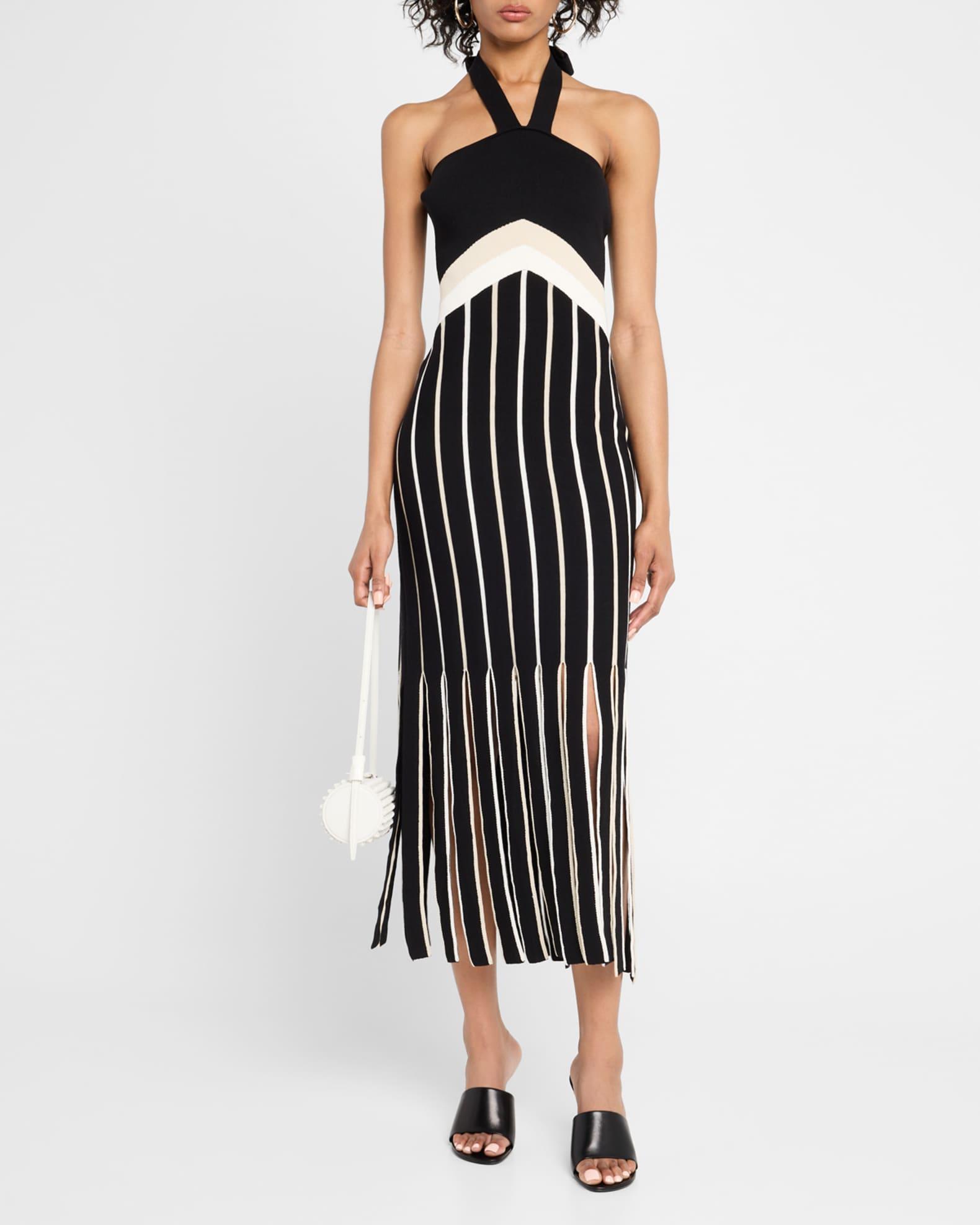 Adorned with multicolor stripes, the "Campbell" dress by Ramy Brook consists of a flattering knit fabrication Approx. 42"L from shoulder to hem Halter neckline; self-ties behind the neck Sleeveless Hem falls below the knee Body-skimming fit A-line silhouette Slipover style Cotton Hand wash or dry clean Imported