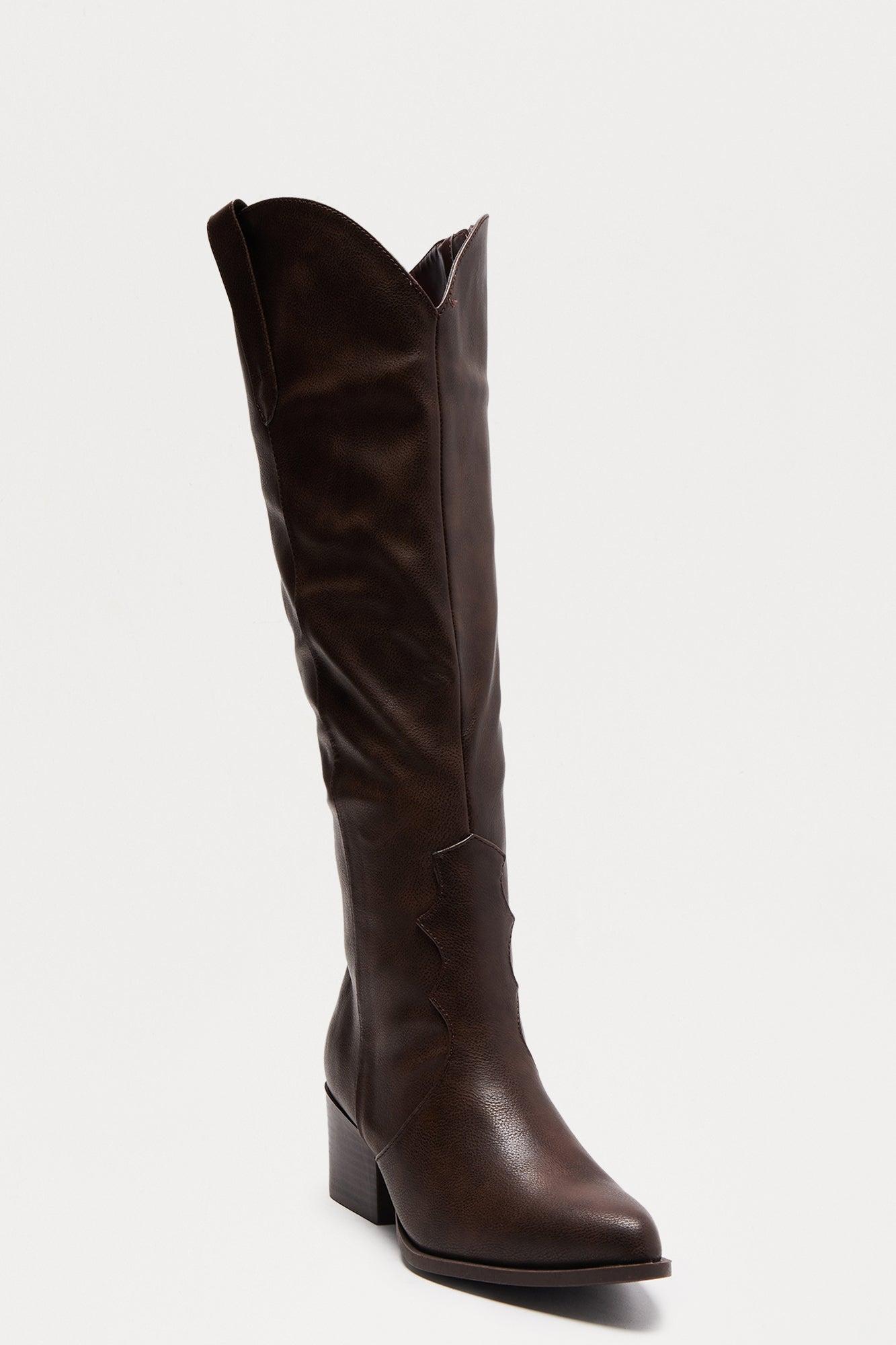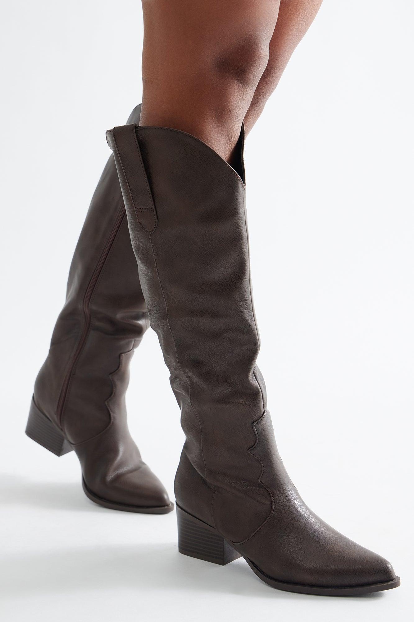 Available In Black, Black/Black And Brown. Knee High Heeled Boots Pointed Toe 2.5" Mid Block Heel Imported