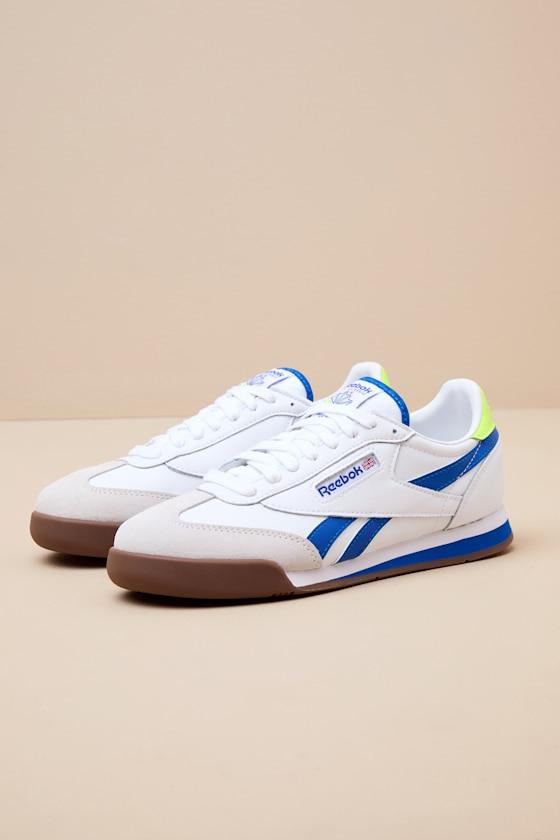 The Reebok Campio XT Ftwr White and Optimum Blue Leather Sneakers make sporty-chic OOTDs so possible (and so adorable)! Genuine leather and suede leather come together to shape these too-cute kicks with a rounded-toe upper, a classic lace-up vamp, and a low-cut collar. An iconic striped design at the instep and outstep sits atop a matching striped gum sole. Logo tags at the tongue, outstep, and neon green heel accent.