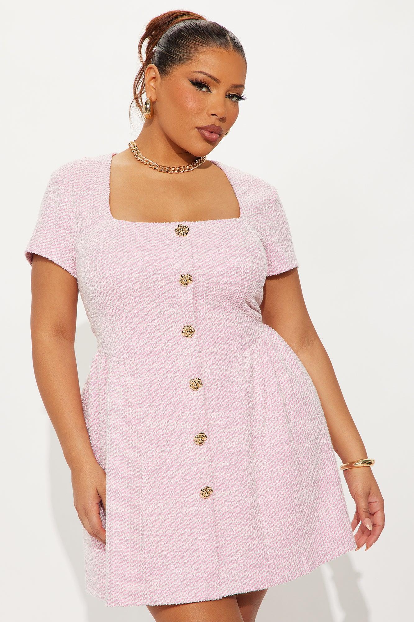 Available In Black, Light Pink And White. Stretch Tweed Mini Dress Square neckline Short sleeves Faux buttons Ruched Back zipper Lined Stretch Length measured flat = 32" Self :71% Polyester 15% Cotton 12% Acrylic 2% Spandex Lining 93% Polyester 7% Spandex Imported Imported