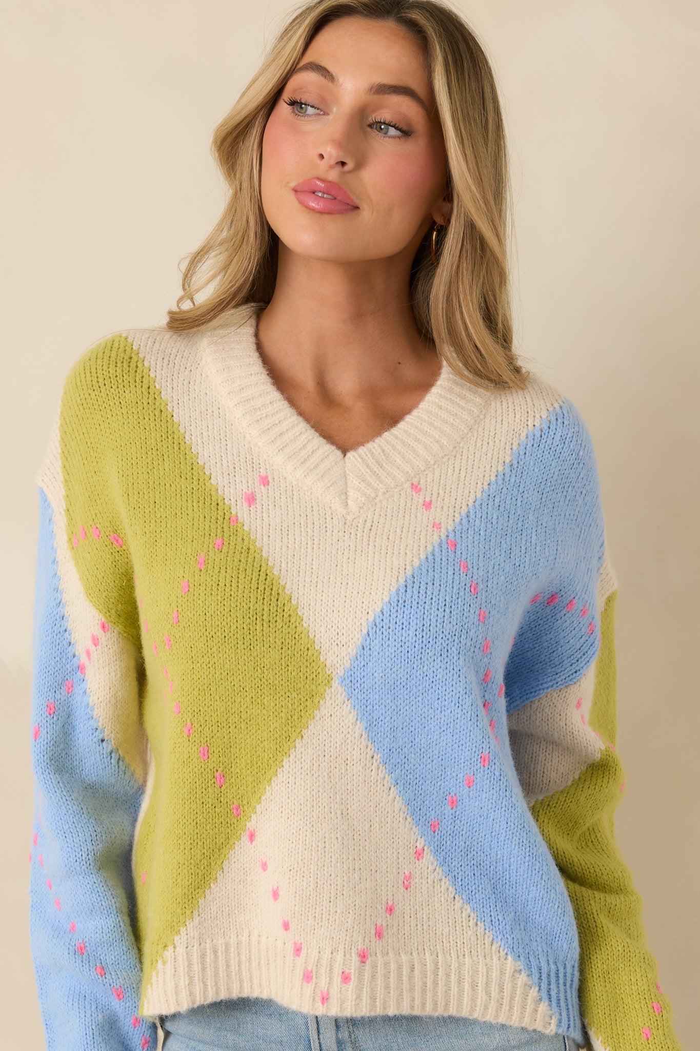 The Can't Go Wrong Green & Blue Knit Argyle V-Neck Sweater brings a fresh, feel-good spin to a classic argyle. Soft green and blue tones meet subtle pink stitched details, creating a look that feels playful yet thoughtfully styled. It’s the kind of knit that brightens your outfit without trying too hard—easy to dress up, easy to live in, and perfect for adding a little color to everyday layers. This green and blue knit sweater features an allover argyle pattern, a V-neckline with ribbed trim, long sleeves, and a relaxed silhouette. Finished with ribbed cuffs and hem for a comfortable, secure fit. 40% Nylon, 32% Mohair, & 28% Wool Unlined Hand Wash Cold Manufactured in China Designed in the USA Model is 5'8" and wearing size small