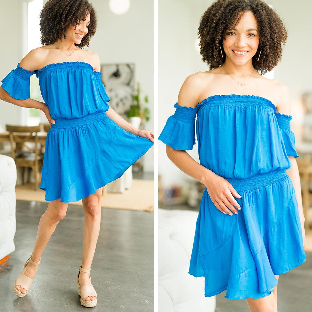 You will never want to leave this fabulous dress behind! That off the shoulder neckline is very feminine and we love the little short sleeves! This dress also has a very comfy and flattering smocked waist. This little cutie is going to be perfect for any summer party! This dress features an off the shoulder neckline, short sleeves, a smocked stretchy waist, and ruffled detailing. Material has no amount of stretch.Leanora is wearing the small.
