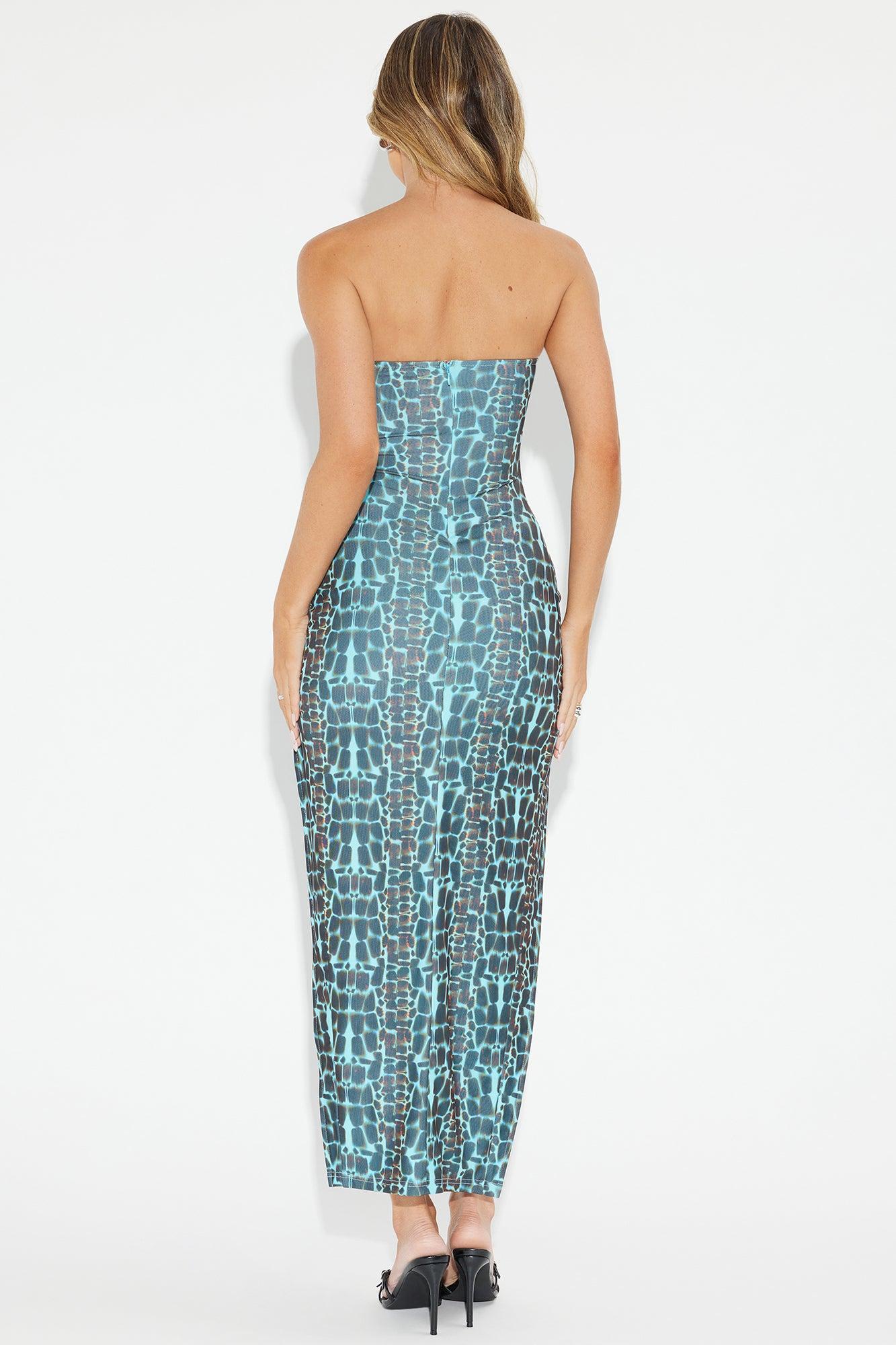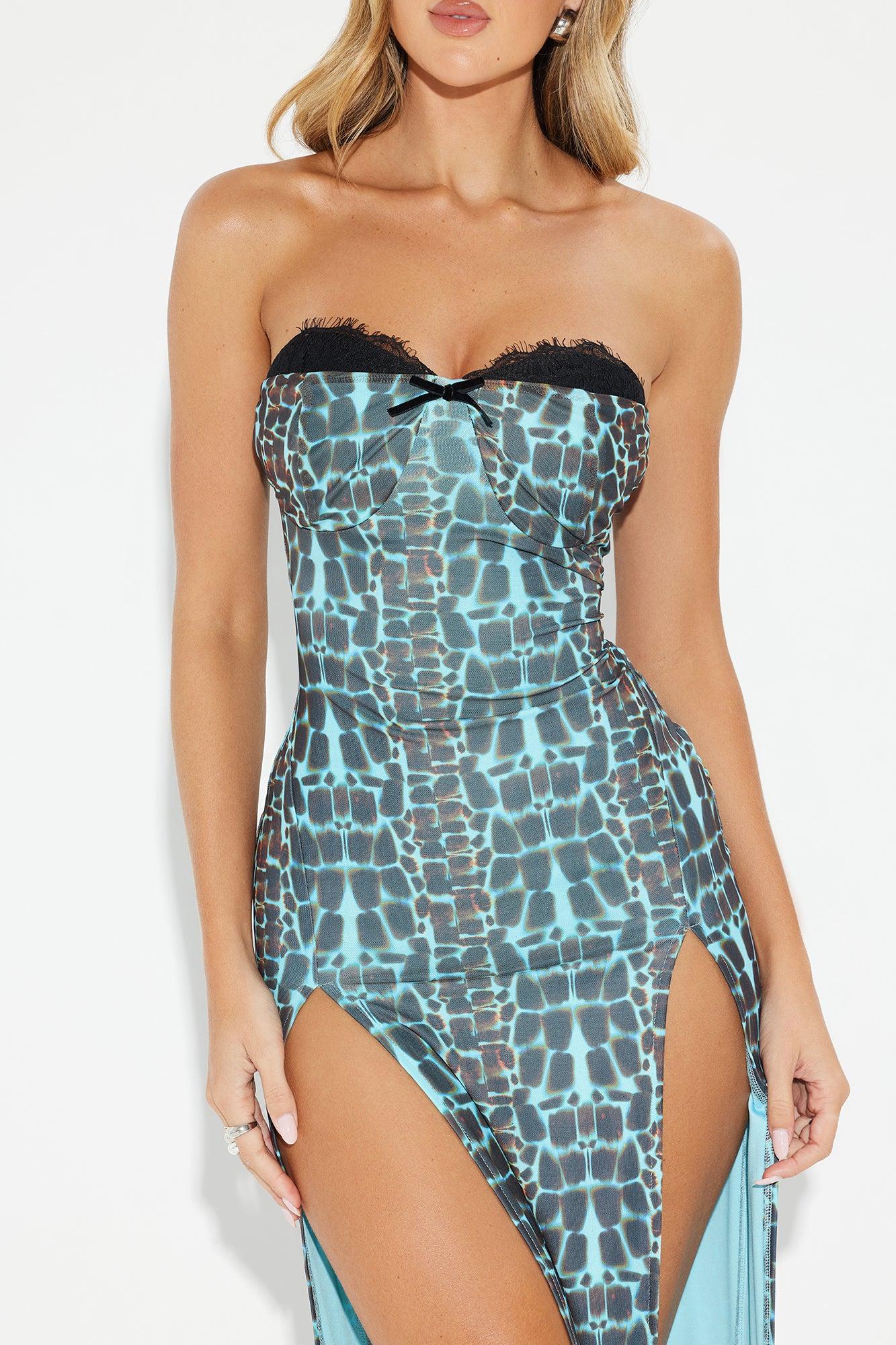 Available In Blue/combo. Mesh Midi Dress Sweetheart Neck Strapless Bra Cup w/ Lace Trim Velvet Bow Detail High Side Slits Hidden Back Zipper Lined Stretch Length = 52" Shell: 80% Polyester 15% Metallic Yarn 5% Spandex Lining: 100% Polyester Imported