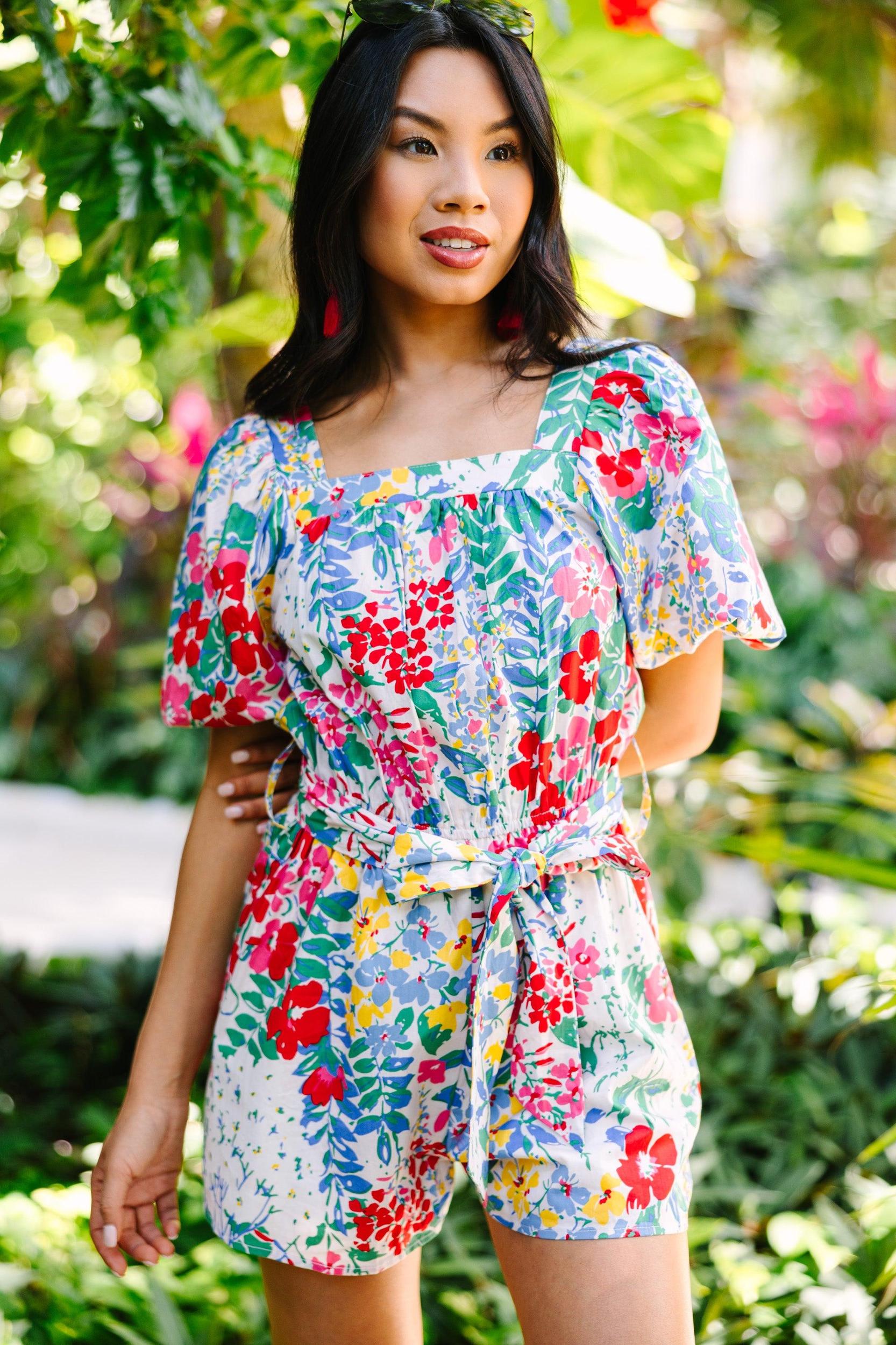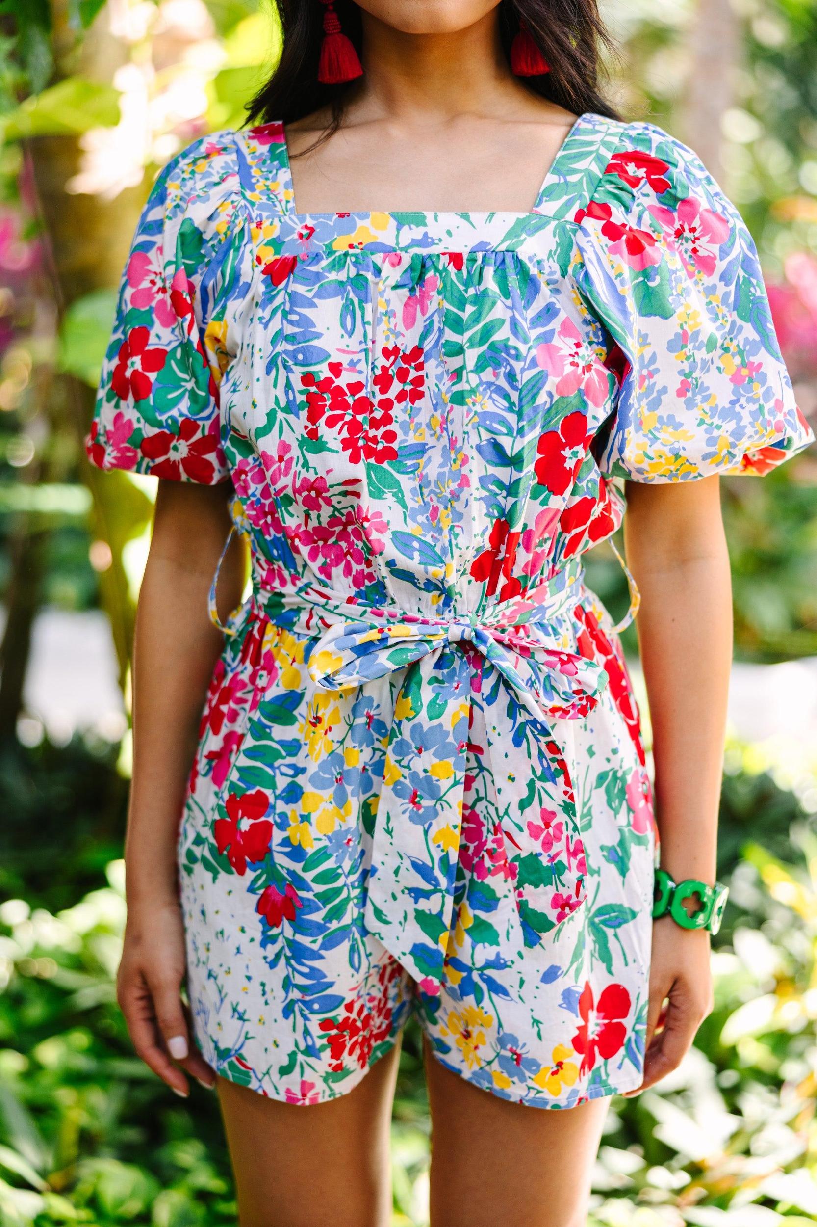 Stand out in this Can't Say No White Floral Romper! This irresistible piece flaunts a bold floral print and irresistible puff sleeves. With a figure-flattering fit, it's perfect for those days when you want to look cute but keep it playful. Simply pair with sneakers or sandals and you're ready to go! This romper features a smocked back, short puff sleeves, a square neckline, a back zip closure, a tied waist, and a colorful floral print. Material has no amount of stretch.Cindy is wearing the small.