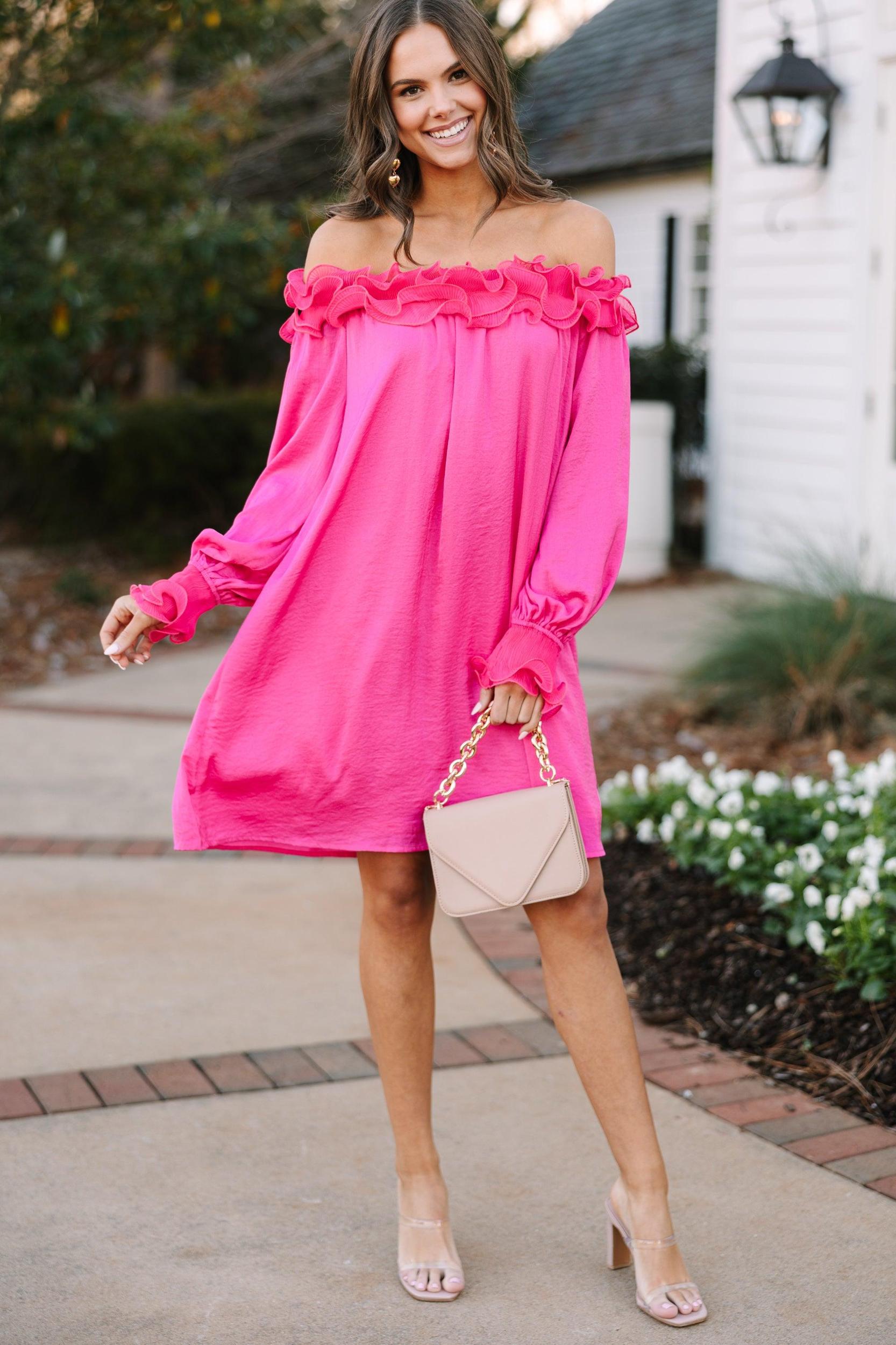 Can you believe this dress?! It's gorgeous! We are absolutely loving that off the shoulder neckline! It's so feminine especially since it's lined with dramatic ruffled detailing! This dress is going to look amazing for attending any dressier wedding or date night! This dress features long sleeves, an off the shoulder neckline, and lots of ruffled detailing. Material has no amount of stretch.Sydney is wearing the small.