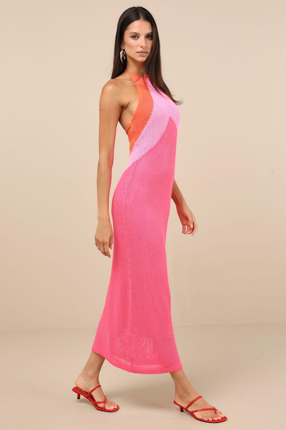 If the beach is beckoning, grab the Cancun Calling Pink Multi Crochet Halter Midi Sweater Dress and hop on the jet! A summery crochet overlay, in bright shades of pink and orange, creates a color block effect across a tying halter neckline and a column silhouette that falls to a midi hem that grazes just above your ankles.