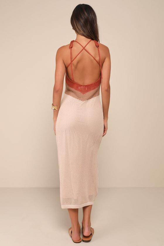 If the beach is beckoning, grab the Cancun Calling Taupe Multi Crochet Halter Midi Sweater Dress and hop on the jet! A summery crochet overlay, in earthy shades of taupe, brown, and rust creates a color block effect across a tying halter neckline and a column silhouette that falls down to a midi hem.