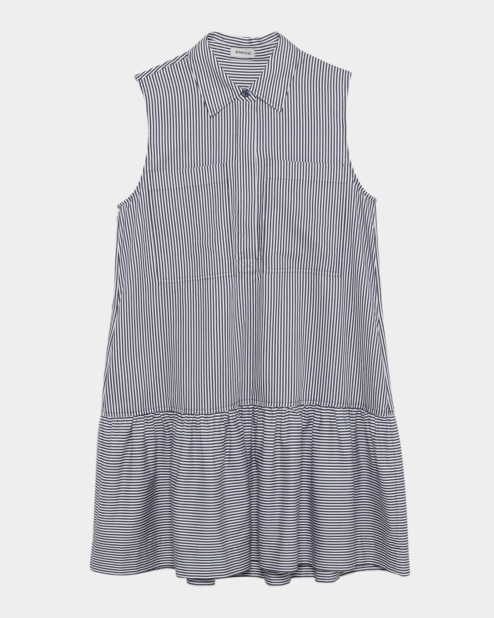 SIMKHAI "Candace" striped cotton-poplin mini dress finished with a flounce hem Point collar; button-placket Sleeveless Dual chest pockets Shirtdress silhouette Hem falls below the knee Slipover style Cotton Machine wash warm Imported