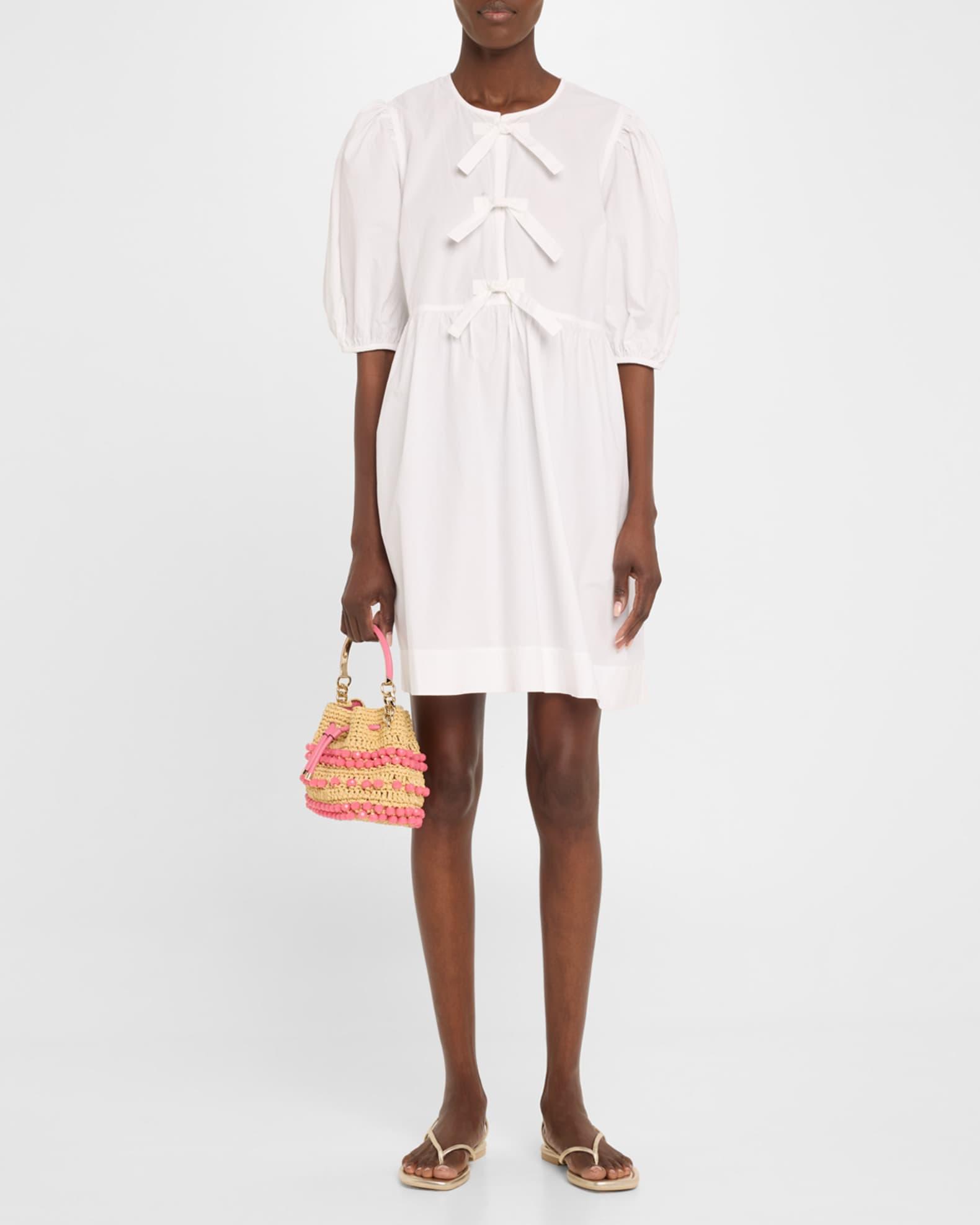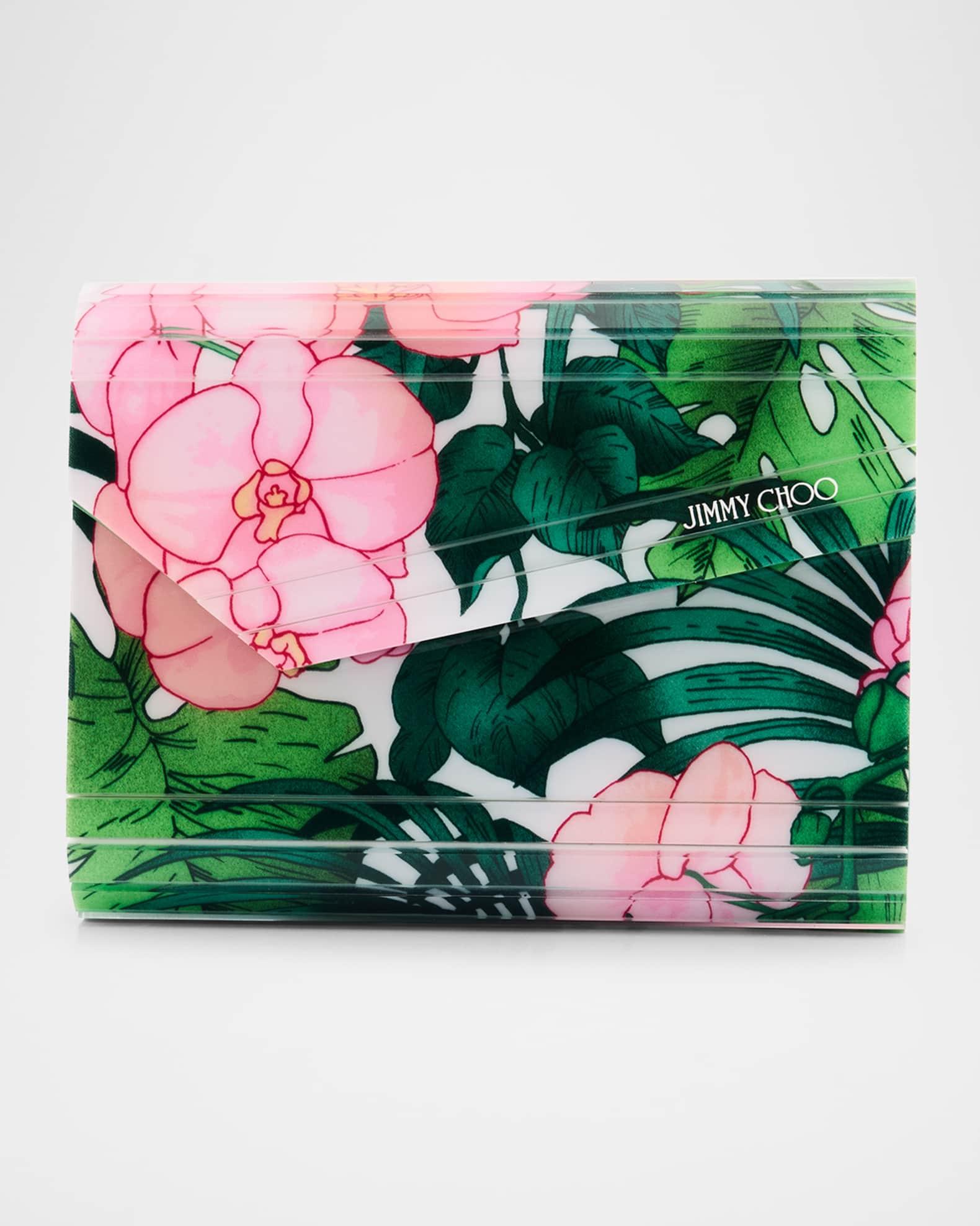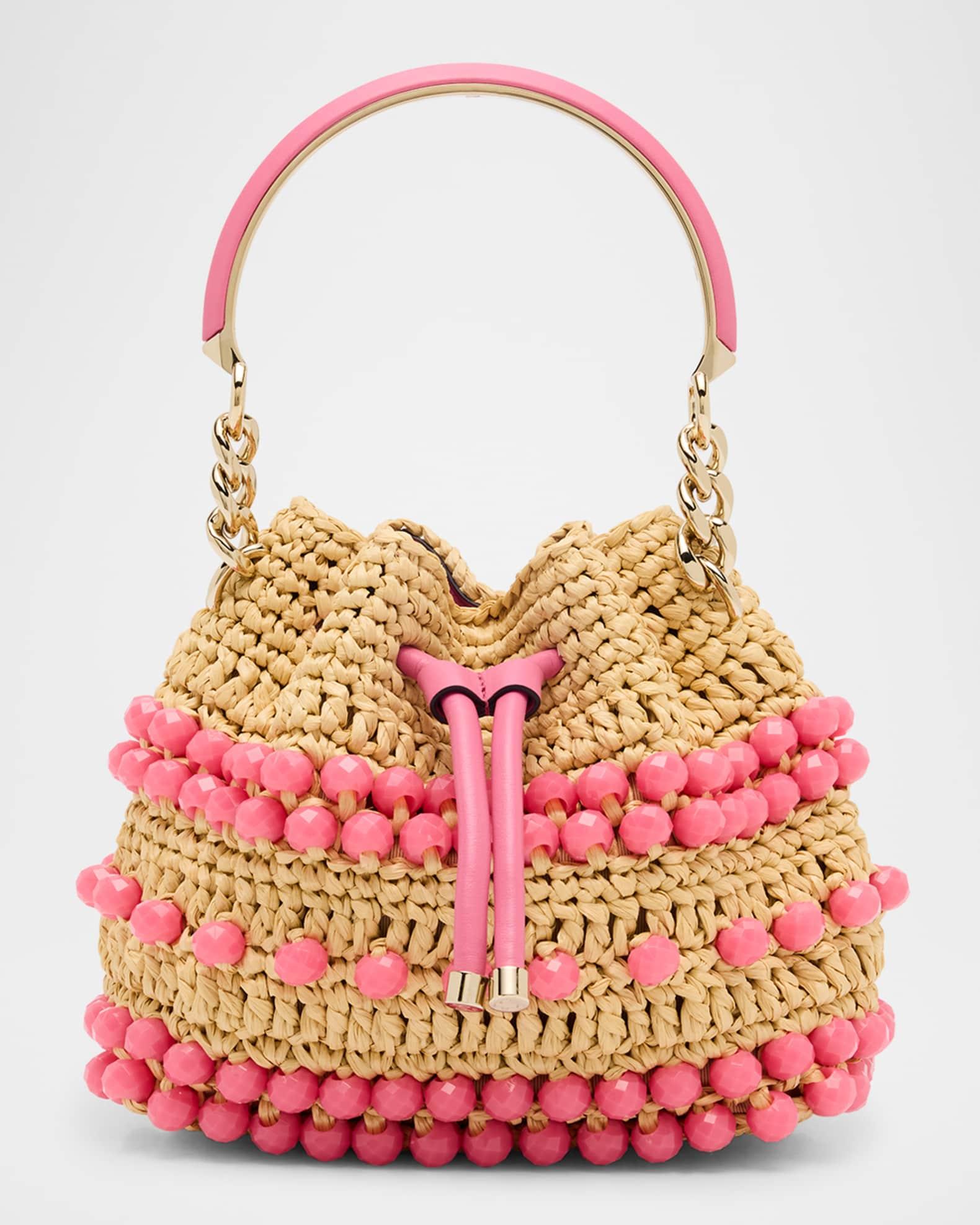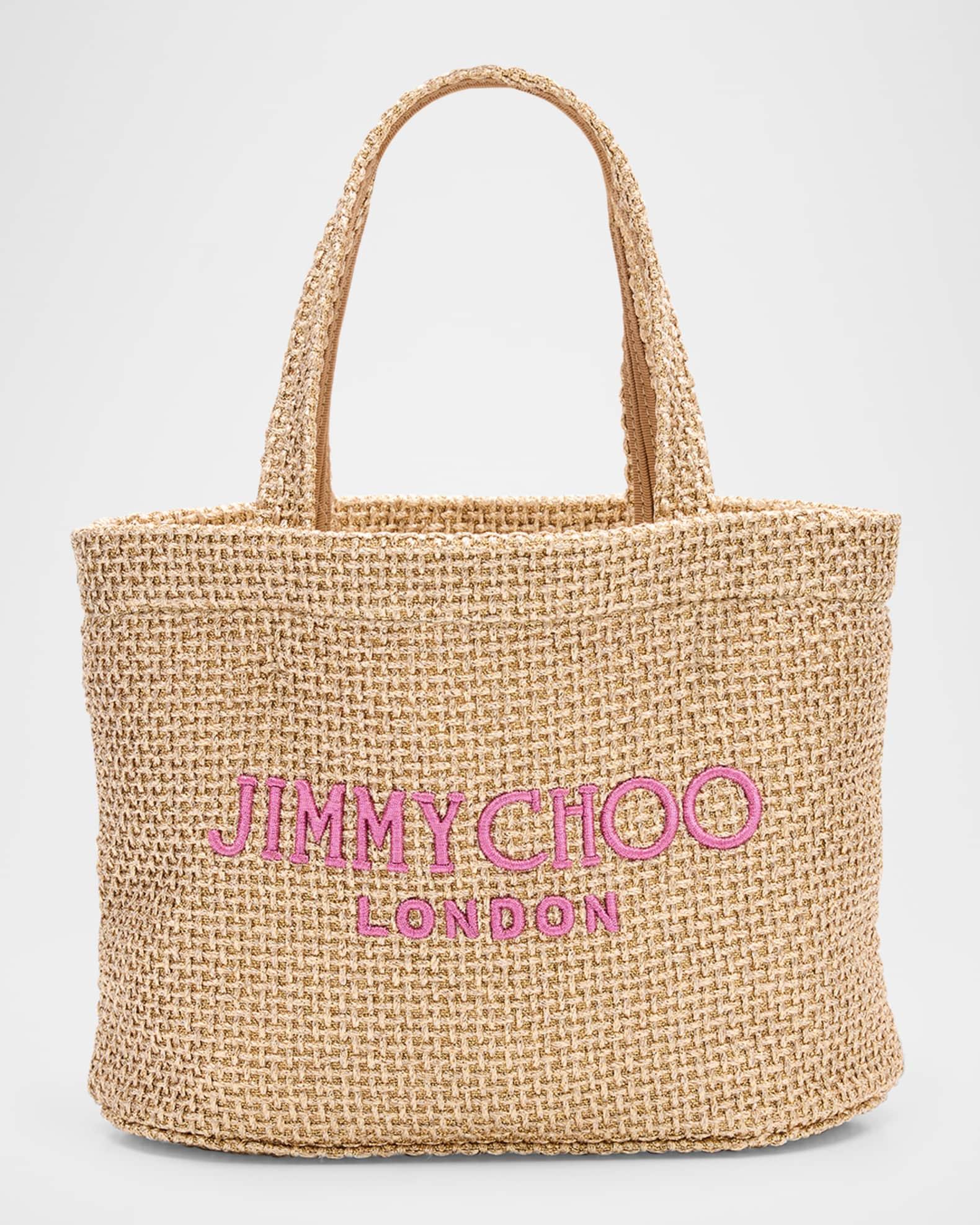 Jimmy Choo metallic raffia beach tote with embroidered logo Top handles Detachable, adjustable crossbody strap Can be worn as a top handle or crossbody bag Open top Lining: Fabric Approx. 6.7"H x 8.7"W x 4.3"D Item Weight (Lbs.): 1.3 Made in Italy
