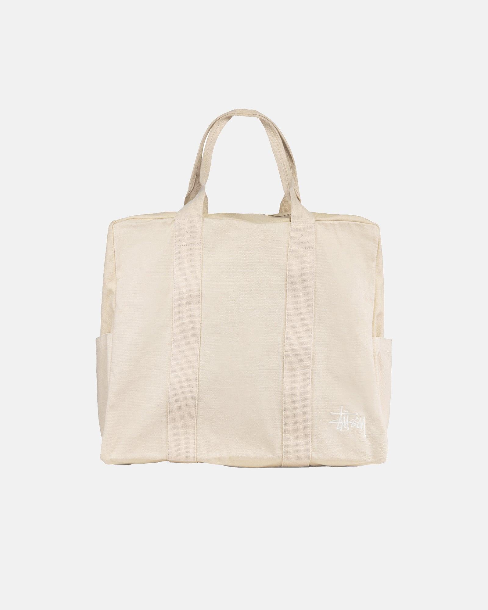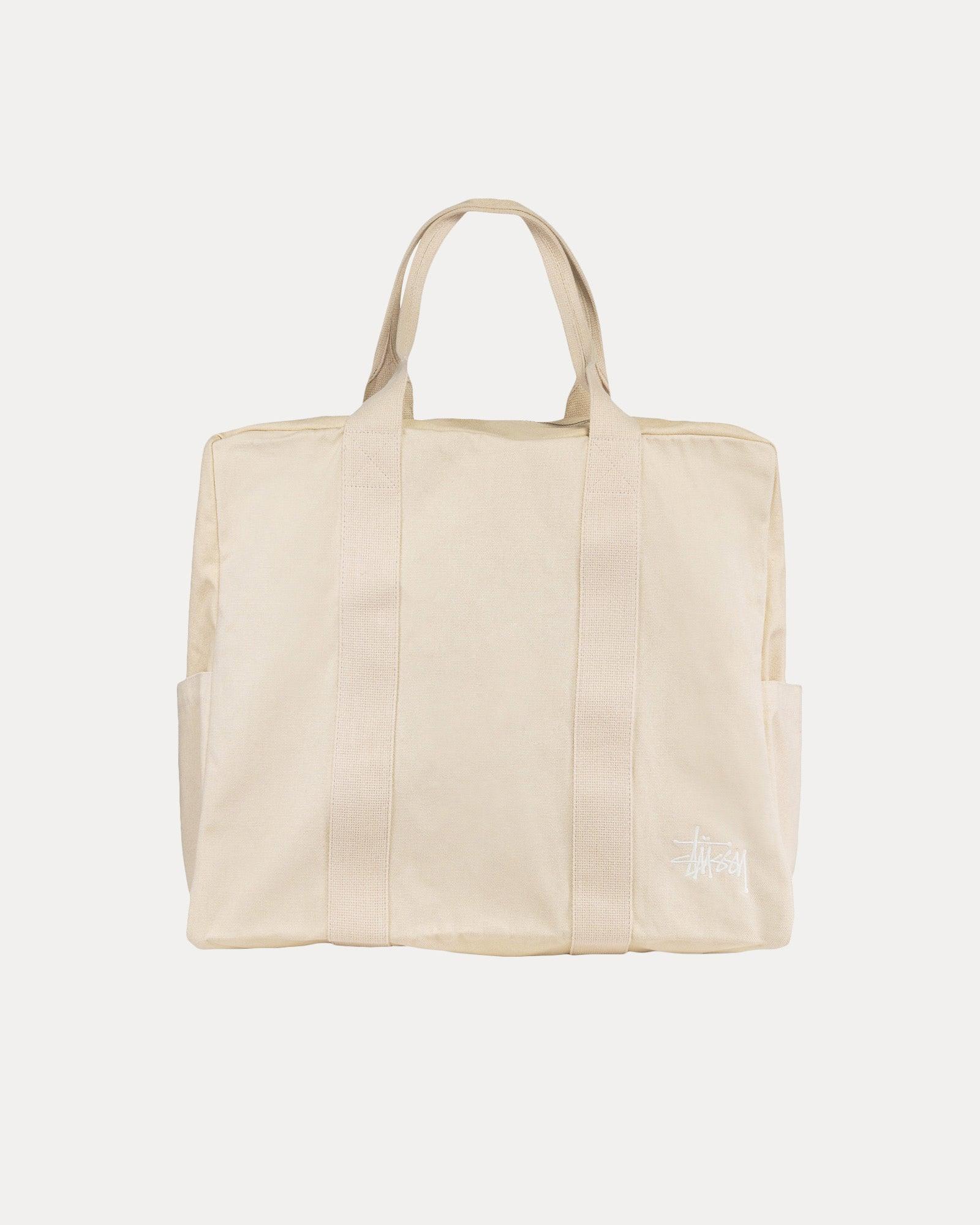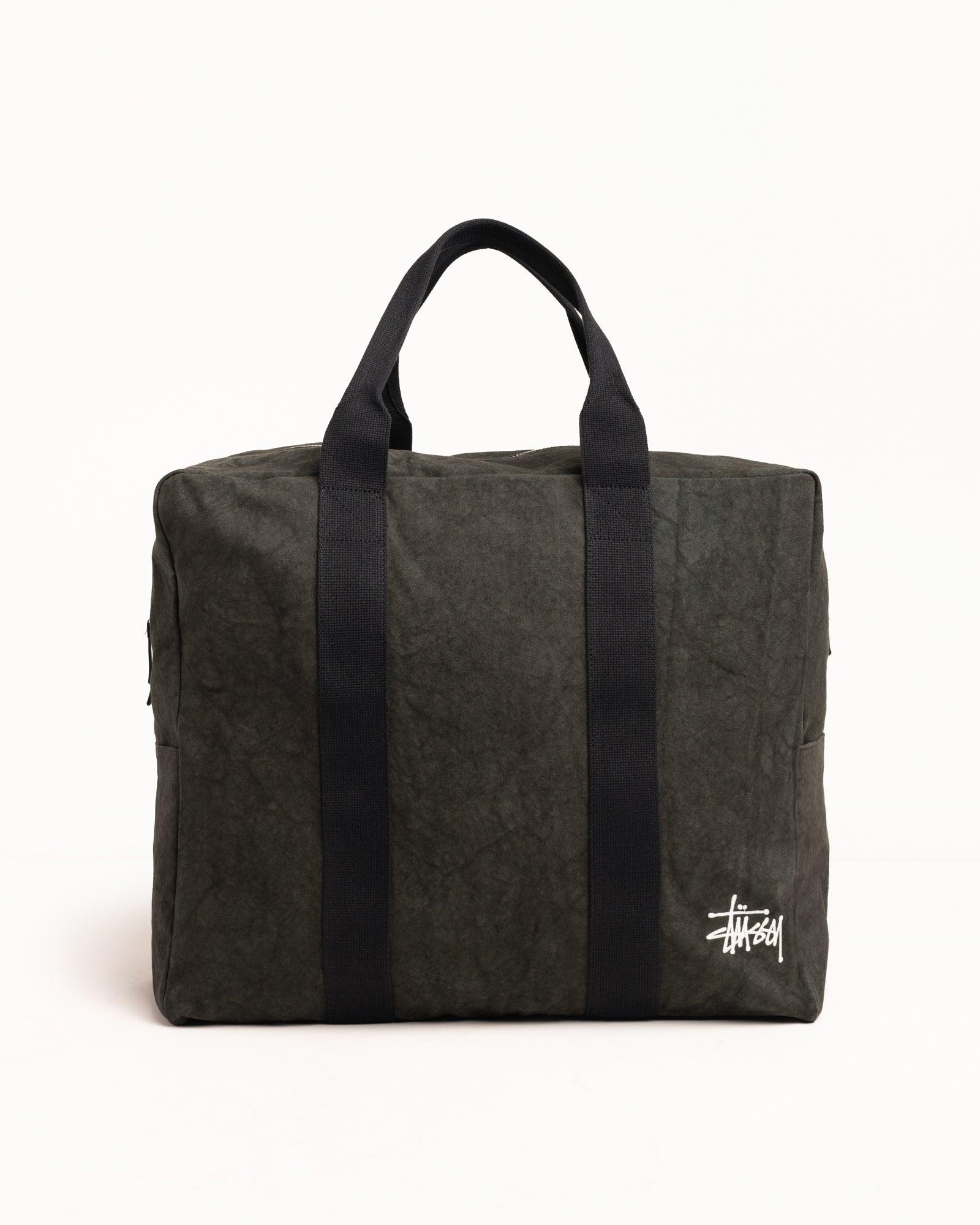 Military inspired canvas flight bag. PRODUCT DETAILS - 54L capacity- 2" webbing handles - 2-way YKK metal zipper with fabric pulls - Side pocket compartment - Large interior pocket - Small interior drop pocket - Stüssy Work Gear label inside - 19.5” W x 17.5“ H x 9.45” D (50cm x 45cm x 24cm) 100% Cotton Imported