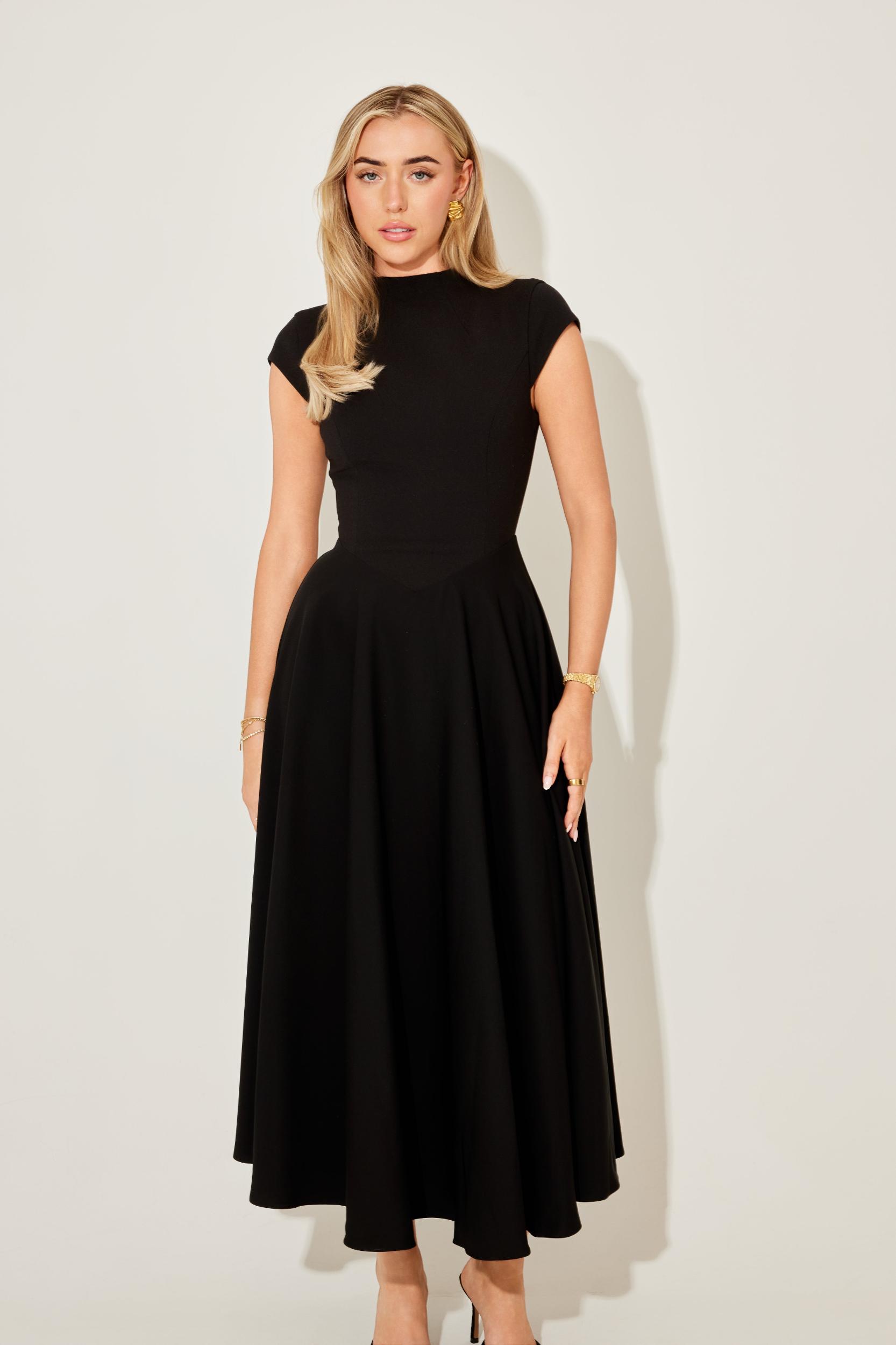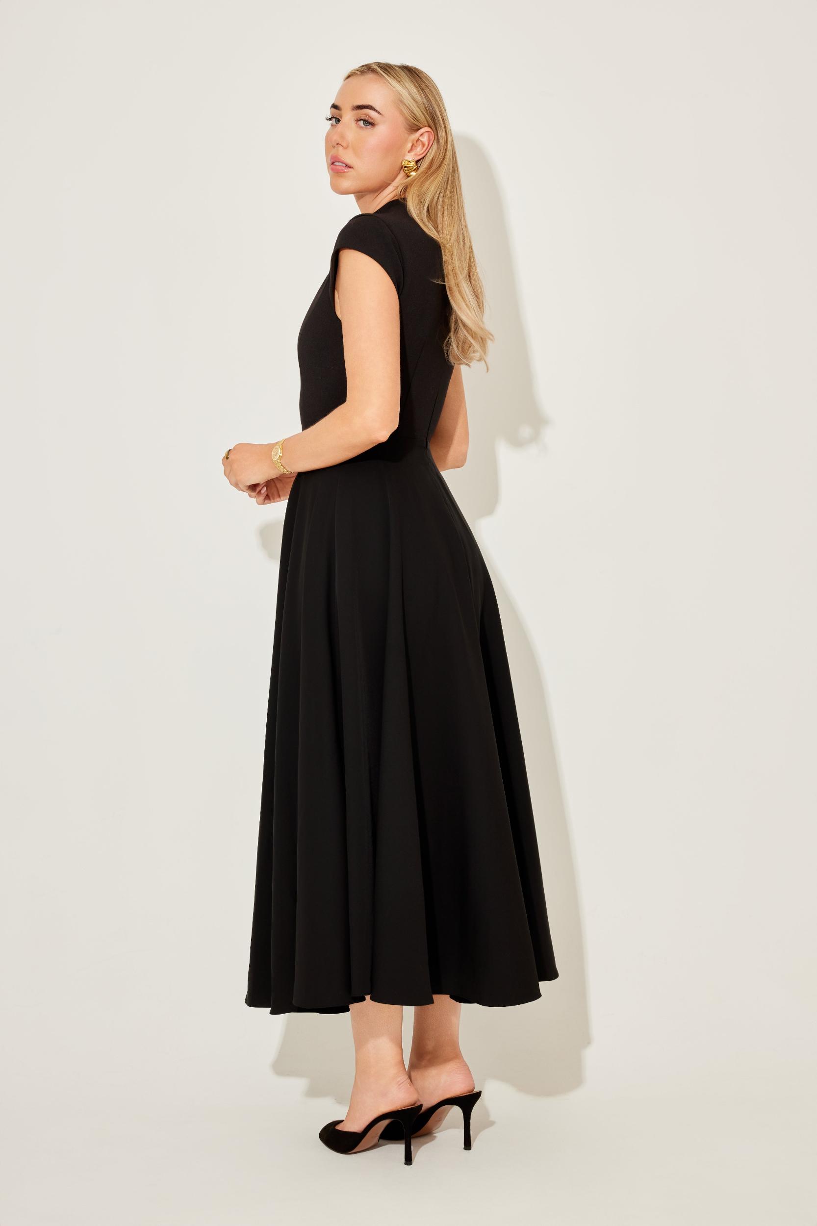 Elevate your wardrobe with our cap sleeve high-waisted midi dress, designed to flatter every Muse. Featuring our signature cap sleeves and a distinctive V-shaped waistline, creating a beautifully tailored silhouette that’s both timeless and modern. Crafted for effortless grace, this dress transitions seamlessly from day to night, making it the perfect choice for any occasion.
